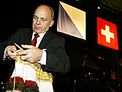 12月18日、新しく国防相に選ばれたウエリ・マウラー氏は、ホームタウンのヒンビル ( Hinwil ) で熱い歓迎を受けた。その際、後にオークションにかけられる毛糸のマフラーを一編みした ( Keystone/Steffen Schmidt )