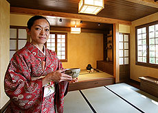 茶畑には1000本の木が植えられ、入り口には神社の鳥居がある。日常のストレスをまずはここに置き去り、茶畑の階段を上がって日本庭園にある東屋へ。奥まったところにあるのは「ローレライ」という茶室だ。夏季の毎水曜日には、近くに住んでいる日本人の成子 ( のりこ ) ・ヴェツォーリさんが抹茶を点てる。