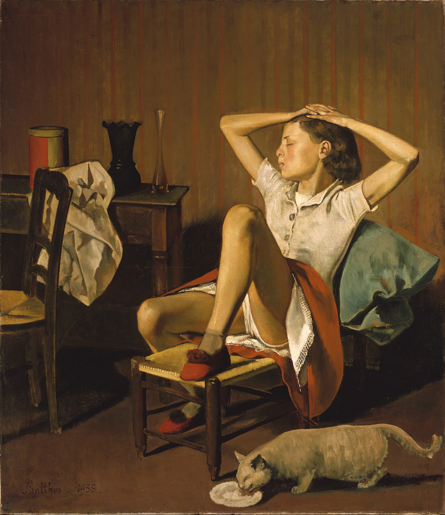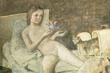 「夢見るテレーズ」の少女の足元で、猫が静かに餌を食べている。「目覚め(II)」の少女が手にする鳥のおもちゃ。それをやはり幼なそうな猫が大きく目を見開いて見つめる。バルテュスの絵の中の猫は、登場人物と呼応し合って、そこにいる。
