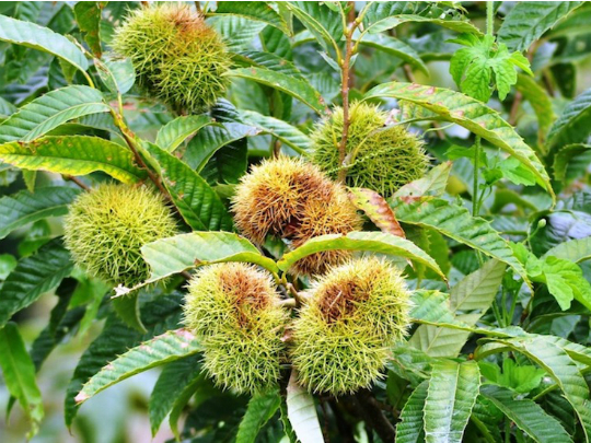 栗の木は初夏にクリーム色の花を咲かせる。ティチーノ州では、栗の花の開花時期に車でハイウェイを走っていると、栗の森が太陽の光を浴びて白く輝いているのに思わず目が釘付けになる。その花が散り、初秋の今、茶色くなる前の新鮮な緑色のいがの中に栗が実っている。