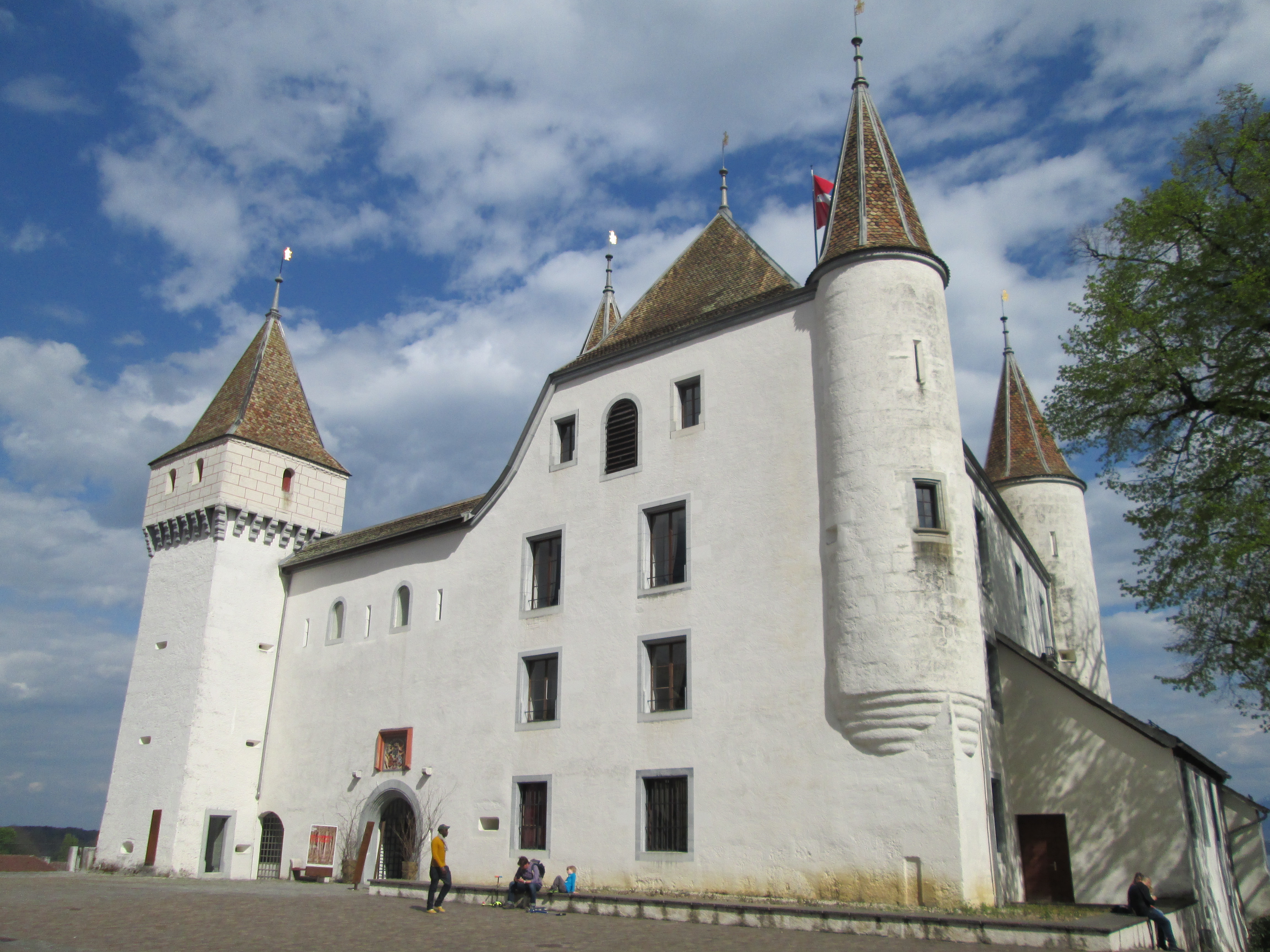 レマン湖を見渡す丘の上に建つ古城は、元々は12世紀半ばこの地方の領主だったプランジャン候が建てたもので、1293年以降になってサヴォワ候の支配下に置かれました。城が現在の姿になったのは16世紀から18世紀にベルン(Bern)が支配していた期間であったとされています。1798年にベルンからの独立を求めてヴォー革命が起こり、1804年、ニヨン市が城を購入して市議会、市庁舎、裁判所(1999年まで使用)、刑務所(1979年まで使用)、博物館(1888年に開館され現存)などを城内に置きました。現在では歴史・陶磁器博物館、特別展覧会場、民事婚の式場となっている他、地下のワイン倉庫はワイン試飲会やコンサートの会場となっています。