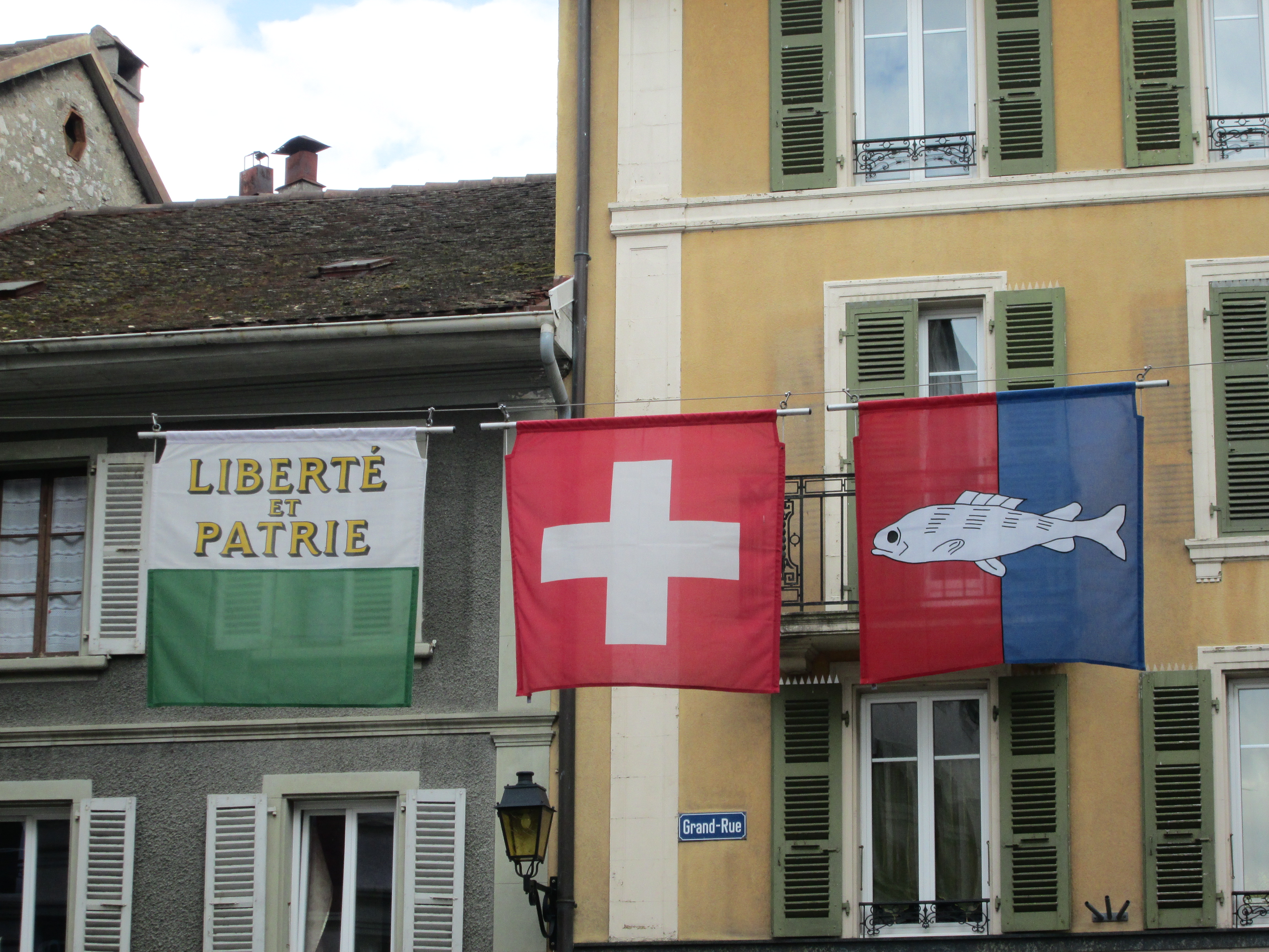左からヴォー州の州旗、スイスの国旗、ニヨン市の市旗 swissinfo.ch