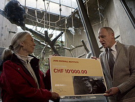 2月20日、ウガンダでのチンパンジープロジェクトを支援するため、同動物園はグドール氏に1万フラン ( 約99万5700円 ) の小切手を贈った。22日、グドール氏はバーゼルで行われた持続可能なライフスタイルフォーラム「NATUR」が主催する会議に出席した。