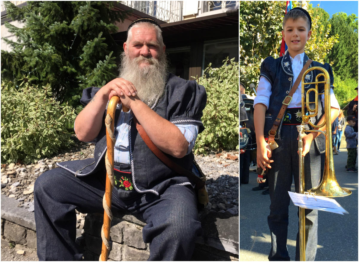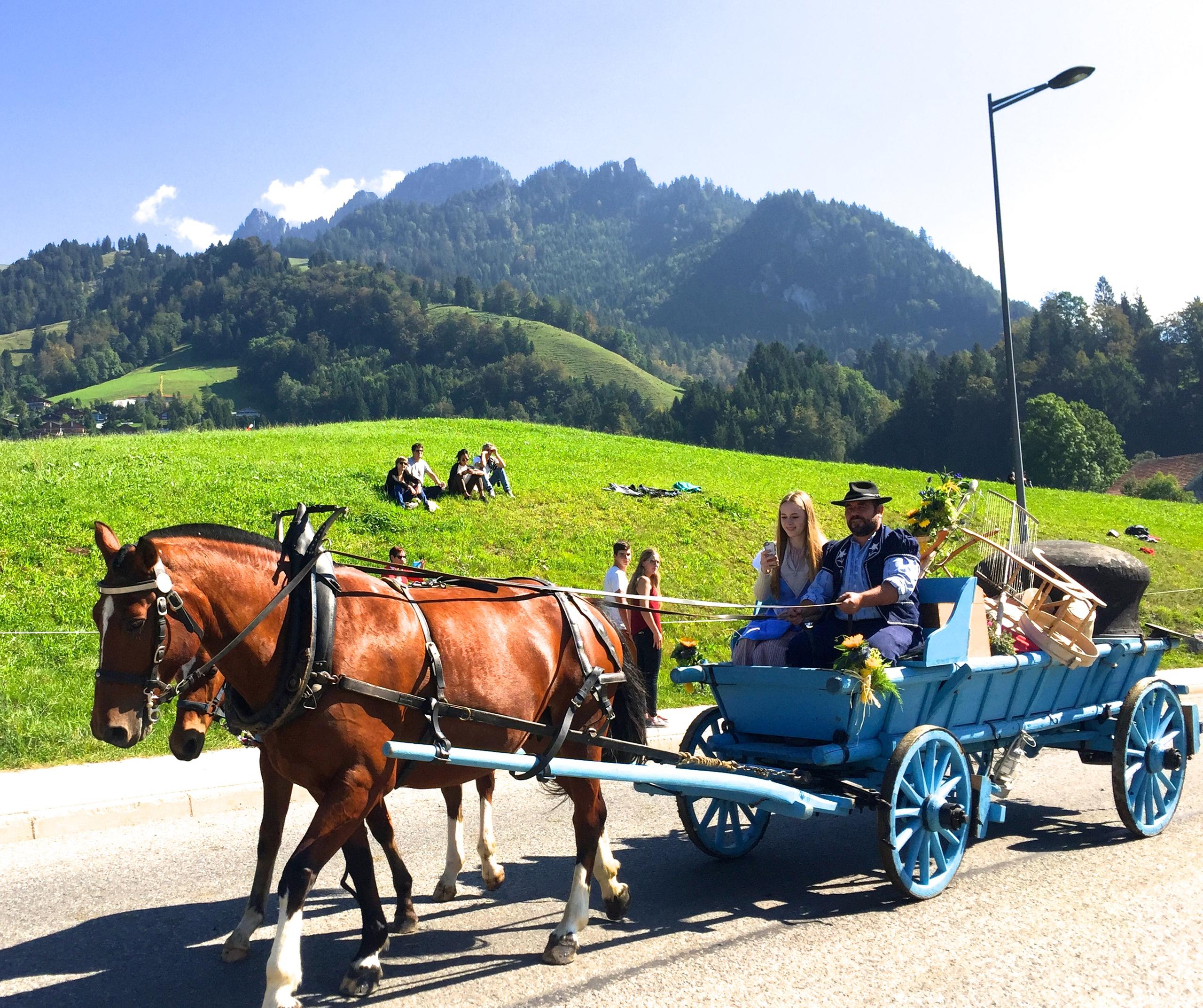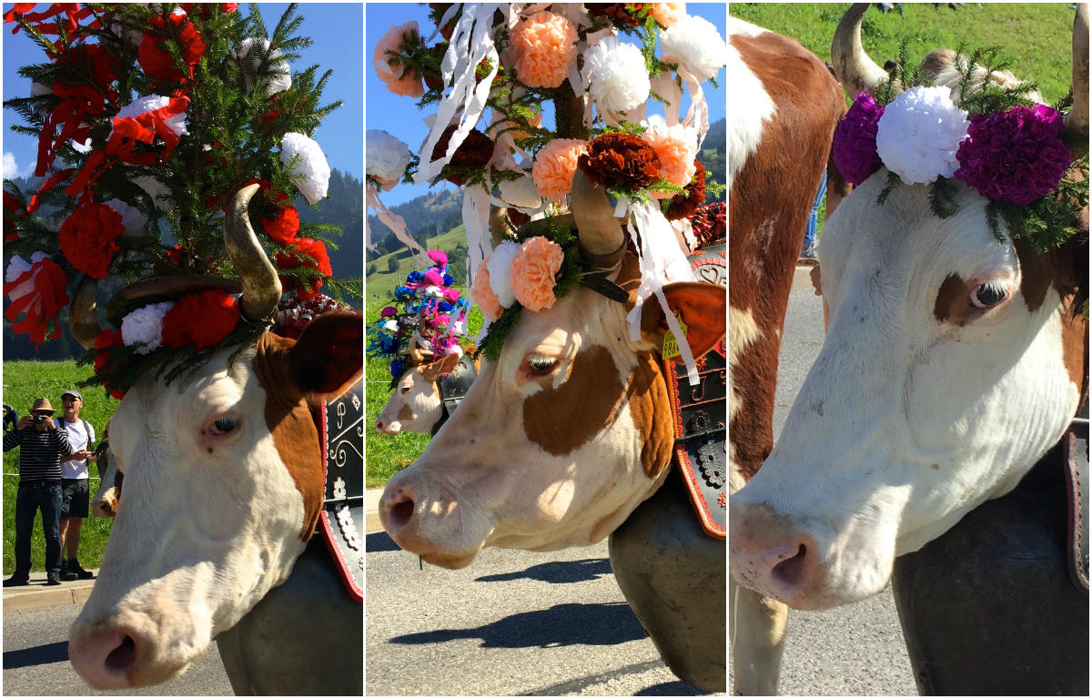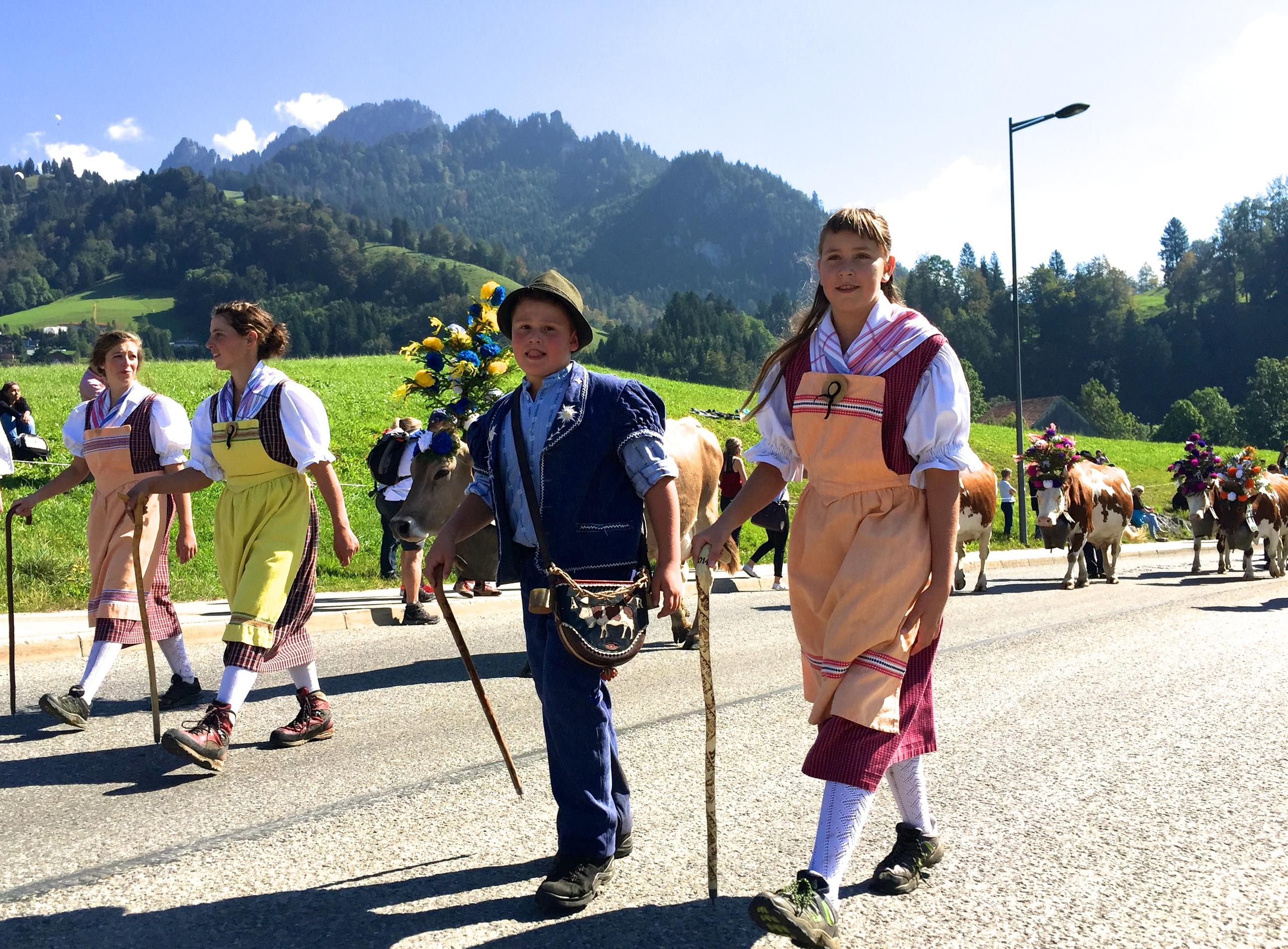 きれいに体を洗ってもらい、晴れ着代わりの飾りをつけた牛たちが 続々とアルプスを下ってくる。 牧夫達も伝統衣装を着こんで誇らしげに歩いてくる。スイス人は伝統衣装を普段着のように自然に着こなす。日本人が着物を着てぎこちなく見えるのと対照的だ。