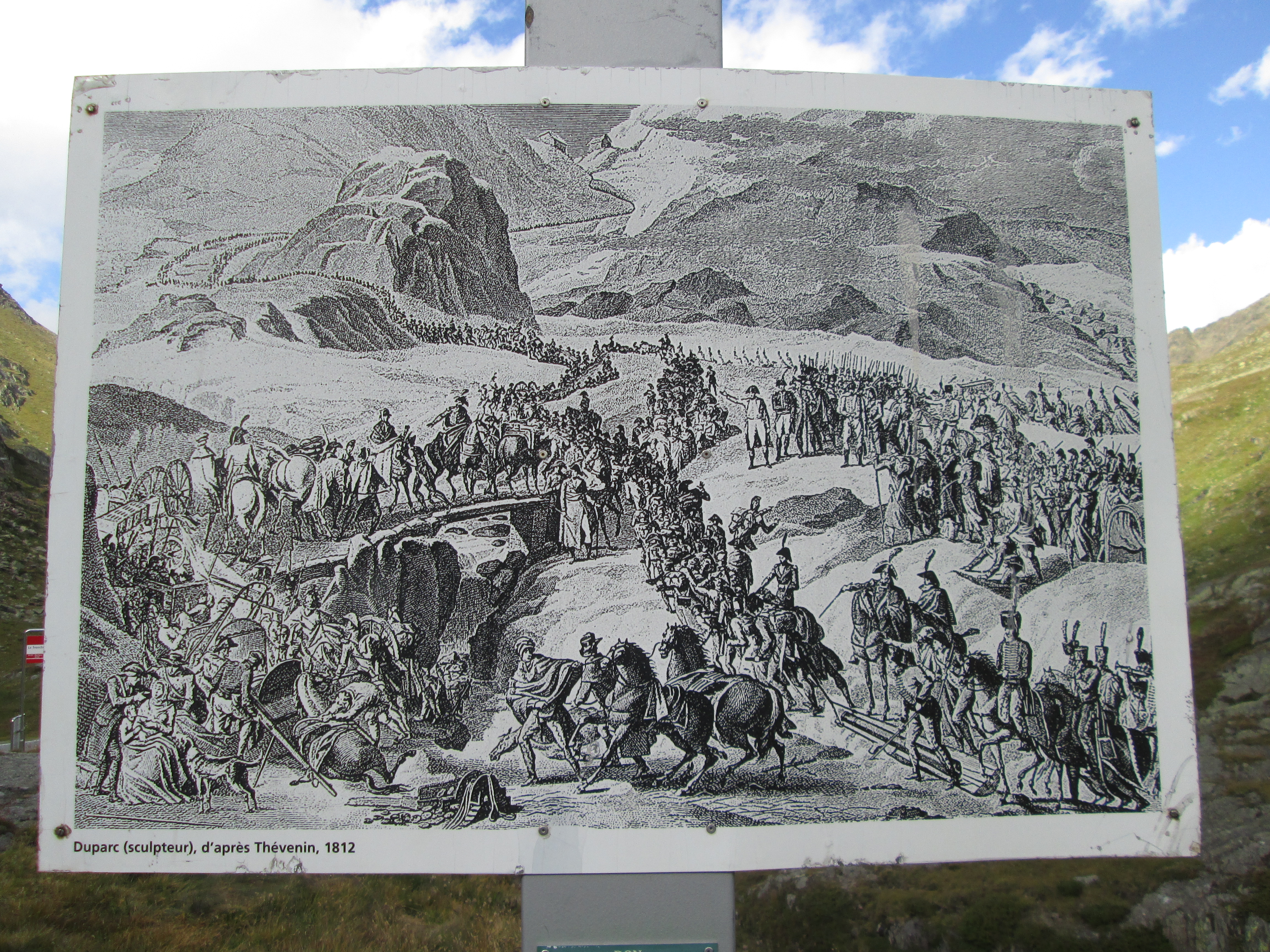 車ですと楽にグラン・サン・ベルナール峠に到着することができますが、看板にある当時の様子を描写した絵には、騎乗の兵士や徒歩の兵士、武器を運ぶ兵士が、長い列を連ねて急勾配の坂道を登っている姿が描かれています。5月の標高2000メートルを超える山々には、まだまだ雪が残っていたであろうことを思うと、この214年前の峠越えがいかに兵士たちにとって危険で体力を消耗するものだったかが想像できます。