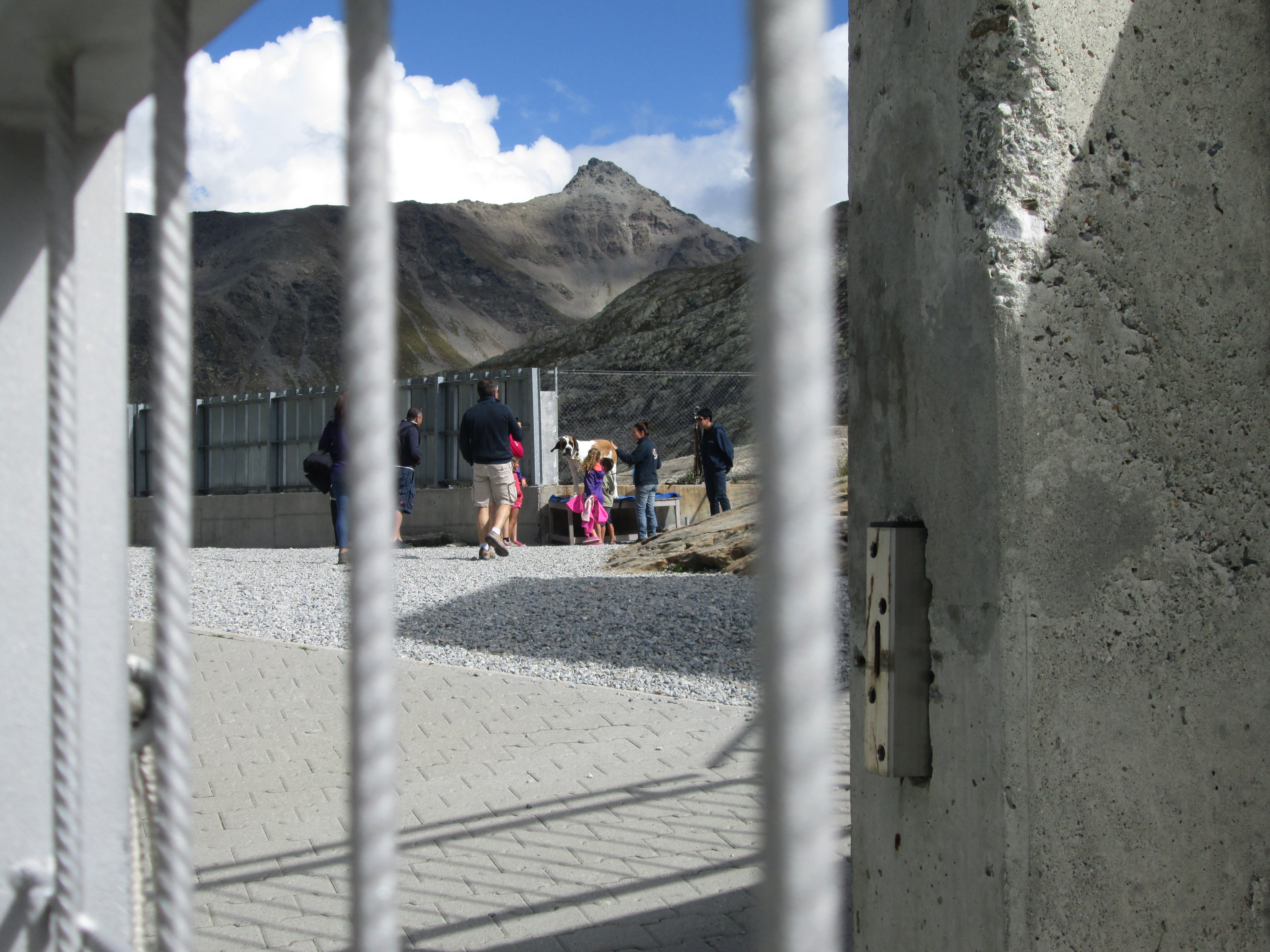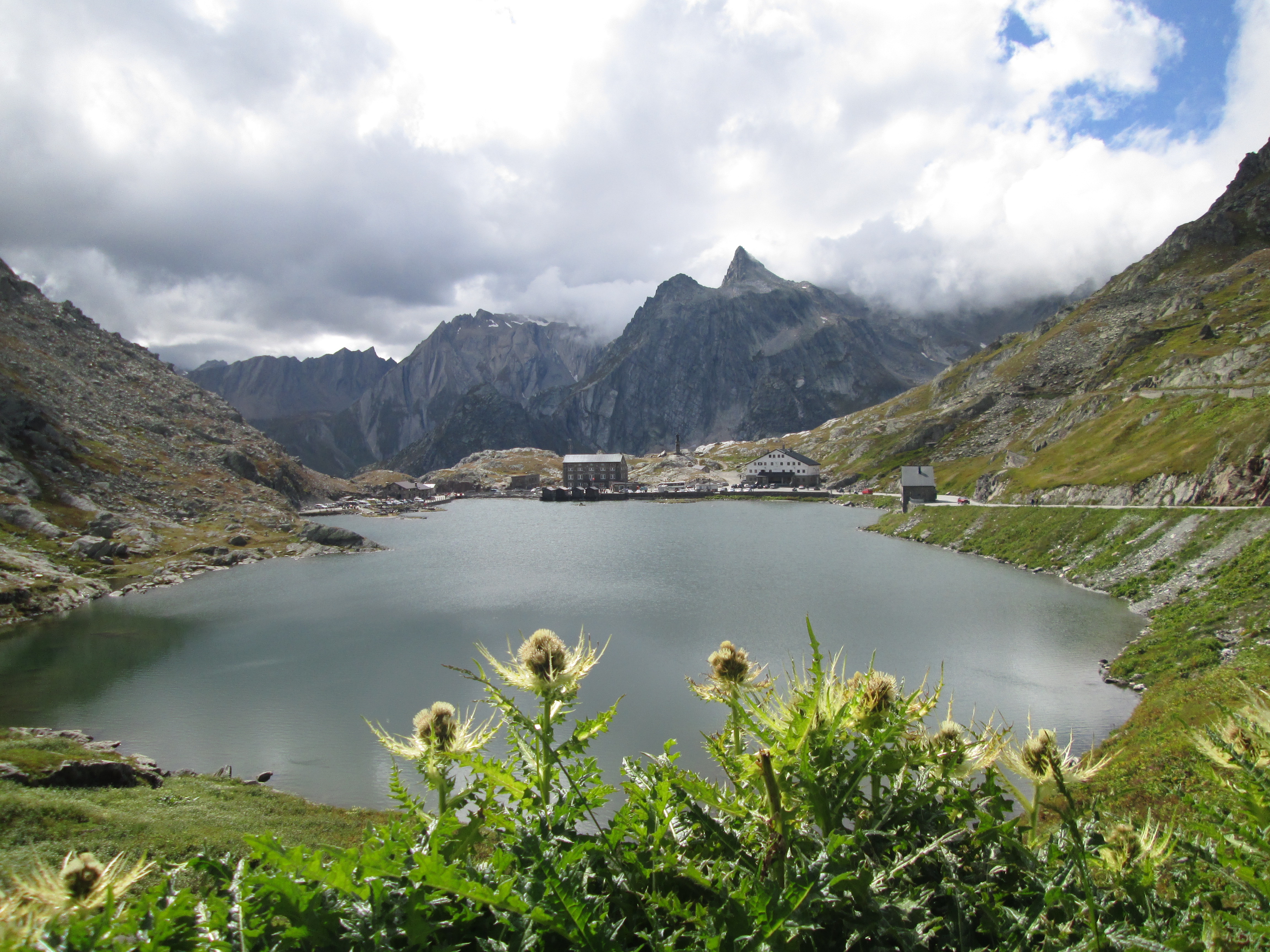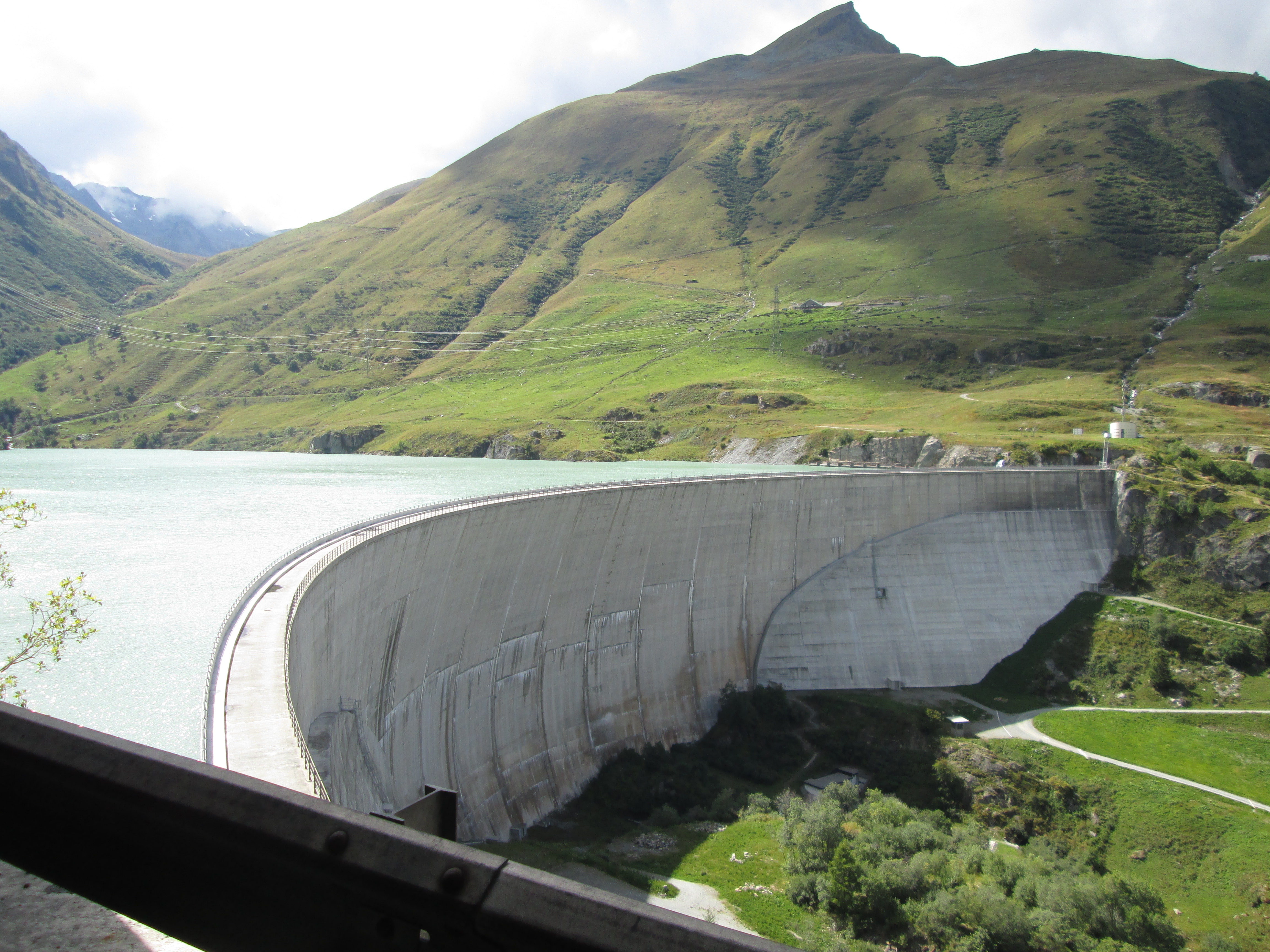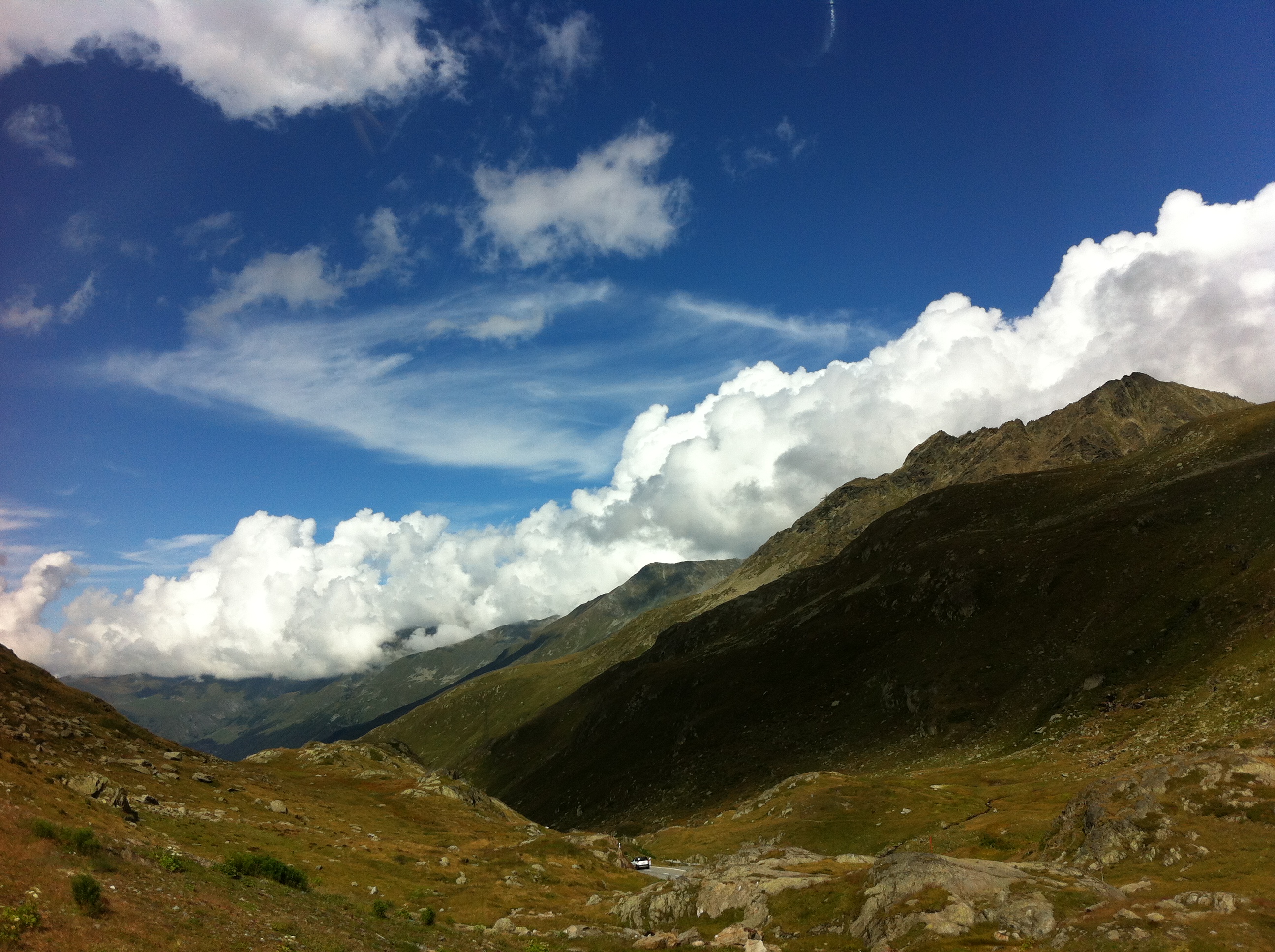 ブール・サン・ピエールの村からグラン・サン・ベルナール峠に向かう途中に、トゥル湖(Lac des Toules)のアーチ式コンクリートダムが見えます。1964年に開通したグラン・サン・ベルナール・トンネル(有料)に向かわずに、途中で右側にそれて旧道のグラン・サン・ベルナール道路を進みます。この辺りまで来ると森林はなくなり、景色は一変します。この先、待ち受けているのは標高2469メートルの峠まで続く上り坂です。