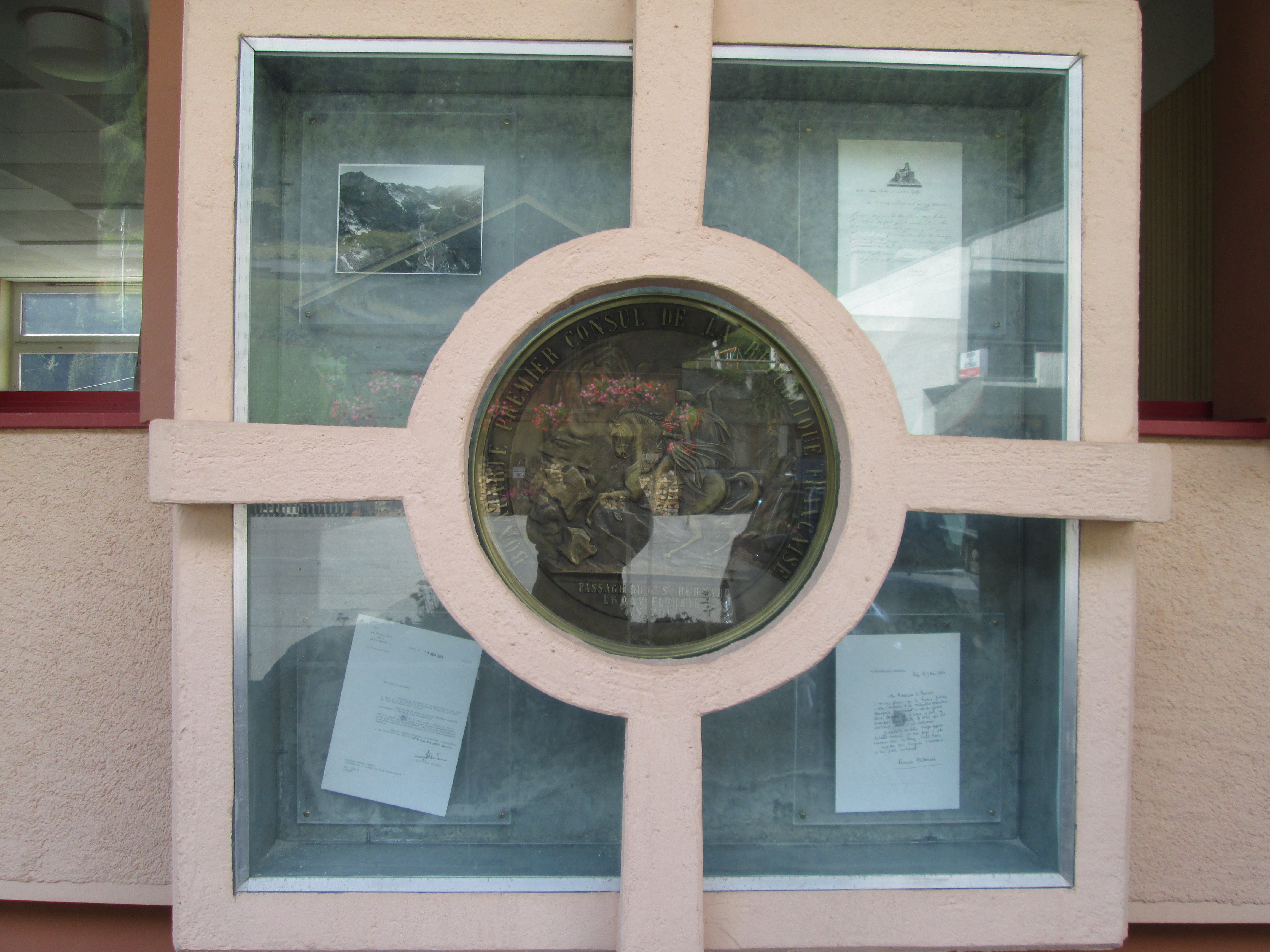 村の役場前のガラスの掲示板には、峠越えをする騎乗のナポレオンを刻んだ銅製メダル、ナポレオンがブール・サン・ピエール村の人々に宛てて書いた署名入りの借用証書(写し)や、故ミッテラン大統領からの直筆の感謝状(写し)など、興味深い展示を見ることができます。