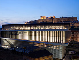 アクロポリス美術館は1階のガラス張りの床から地下の考古学現場を覗き、2階では「森の木立ち」のように配置されたギリシャ古典時代の彫刻を鑑賞し、最後の階では光溢れる四方360度がガラス張りの空間から、丘の上のパンテオンやアテネの街を眺められる。