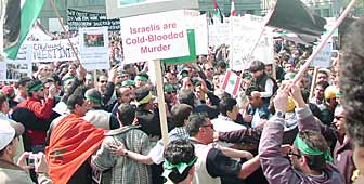パレスチナ人犠牲者らの写真を掲げたデモ隊は、「イスラエルは殺人鬼だ」と叫びながらベルン市街をブンデスプラッツ(連邦議事堂前広場)まで行進した。デモに参加したメントレー(緑の党)やカバリ(社会民主党)など連邦議会議員らは、シャロン・イスラエル首相の辞任や、スイス政府に対して対イスラエル経済制裁発動を呼び掛ける演説をした。デモ隊はその後、全ての犠牲者のために黙とうしパレスチナ国家斉唱後、解散した。
