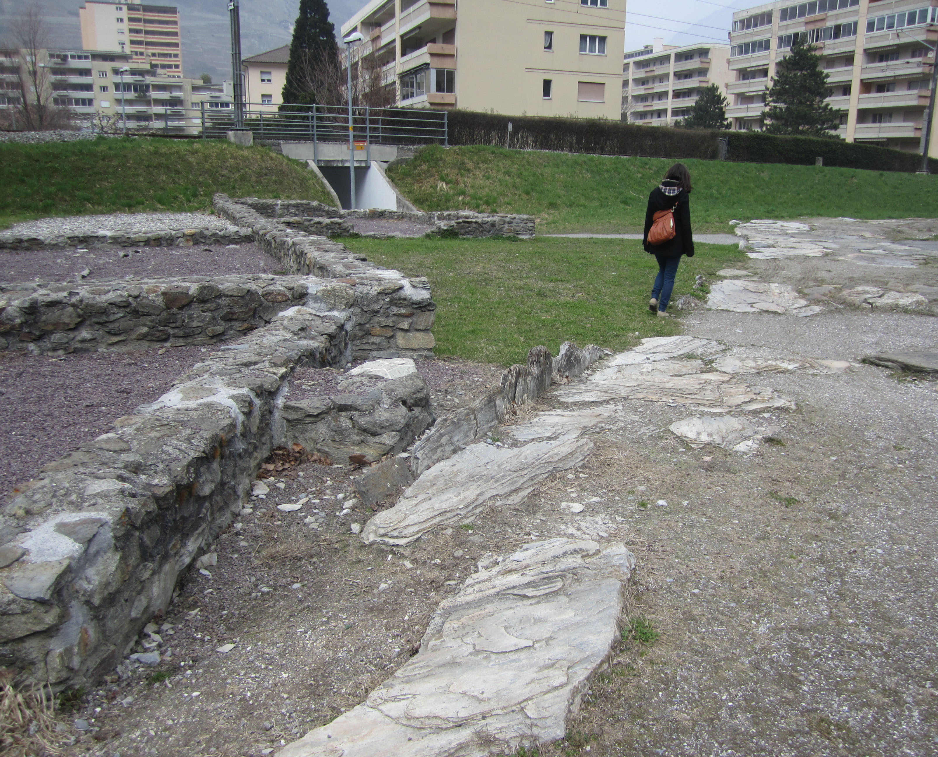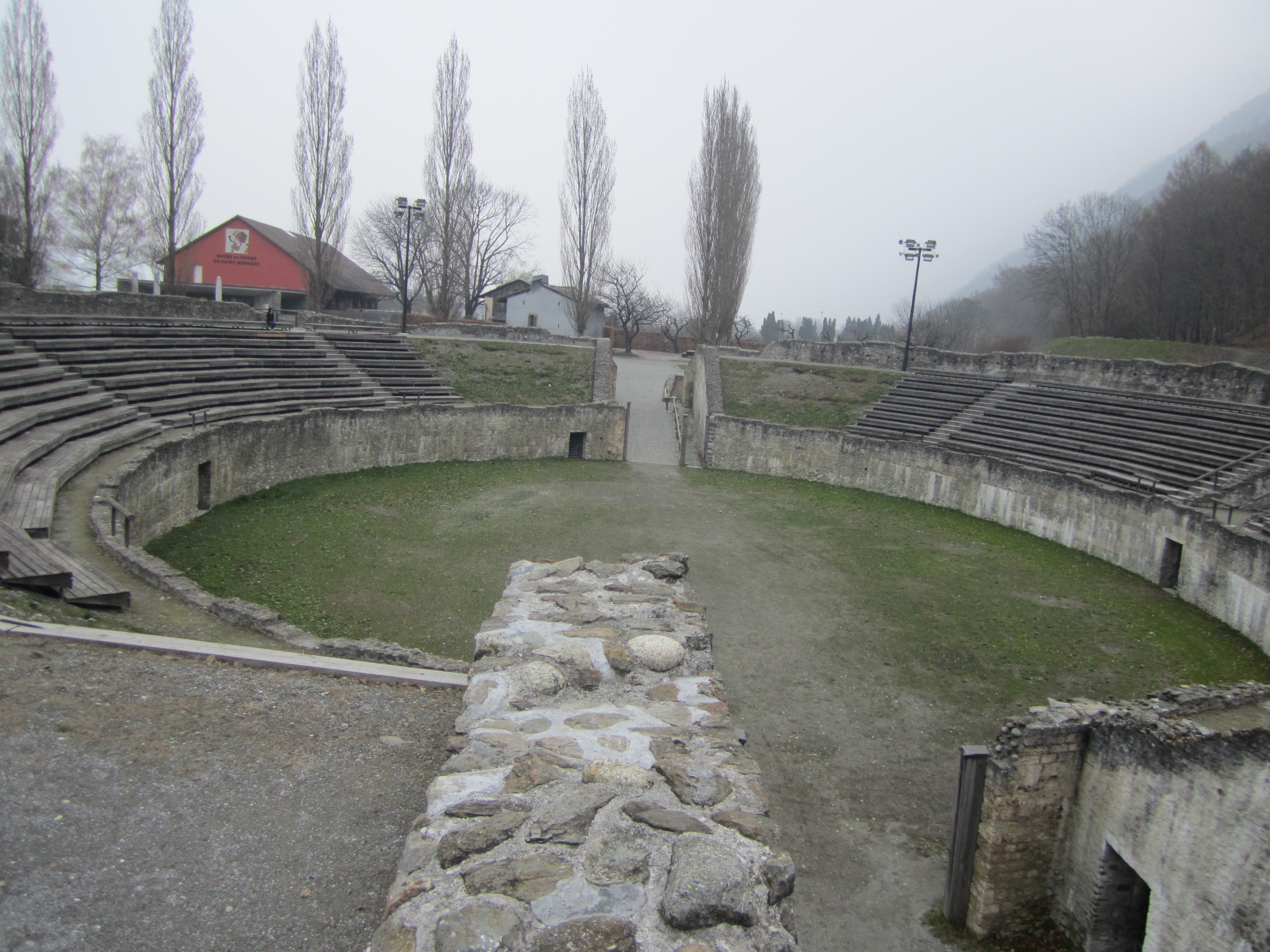 まず、見学自由の円形闘技場に入ってみた。2世紀初期の建造で、皇帝トラヤヌスの時代のものと言われている。小規模だが、よく保存されている。現在はスイス連邦の所有となり、野外映画祭などのイベントに使用されている。闘技場の傍には森林沿いに小道が延びており、散歩に最適である。その脇に流れる小川も当時の水路である。幹線道路を挟んで向かい側には、「ポエニナエ街道(Voie poenine)」と名付けられた石畳と建物跡がある。この遺跡も自由に訪れることができる。石を踏みしめながら、今から2000年も前にヨーロッパを縦断する旅人や商人がこの上を行き交っていたのかと思うと、感無量であった。