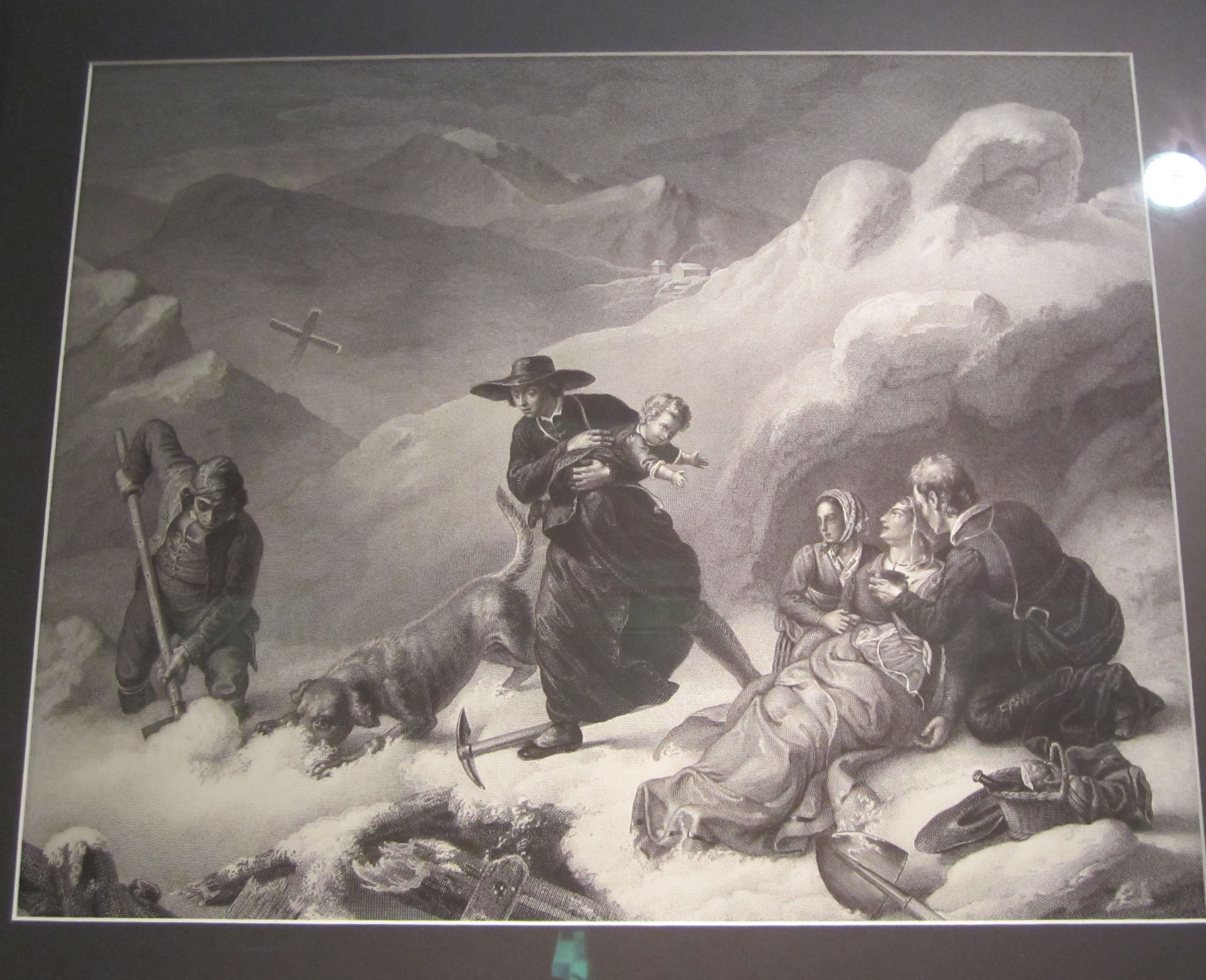 アルペン・マスティフは、17世紀ぐらいから、グラン・サン・ベルナール峠のホスピスで飼われ、番犬や雪山遭難救助犬として活躍し始めた。現在の役割とは違い、元々、ホスピスは中世ヨーロッパで修道院が作った巡礼者の宿泊施設であった。また、病や怪我などで旅人がすぐに旅立てない場合は看護にあたり、病院の役割もした。当時の犬の活躍は数々の絵画に残され、この博物館に多く展示されている。犬の名前の由来は、この峠からきている。