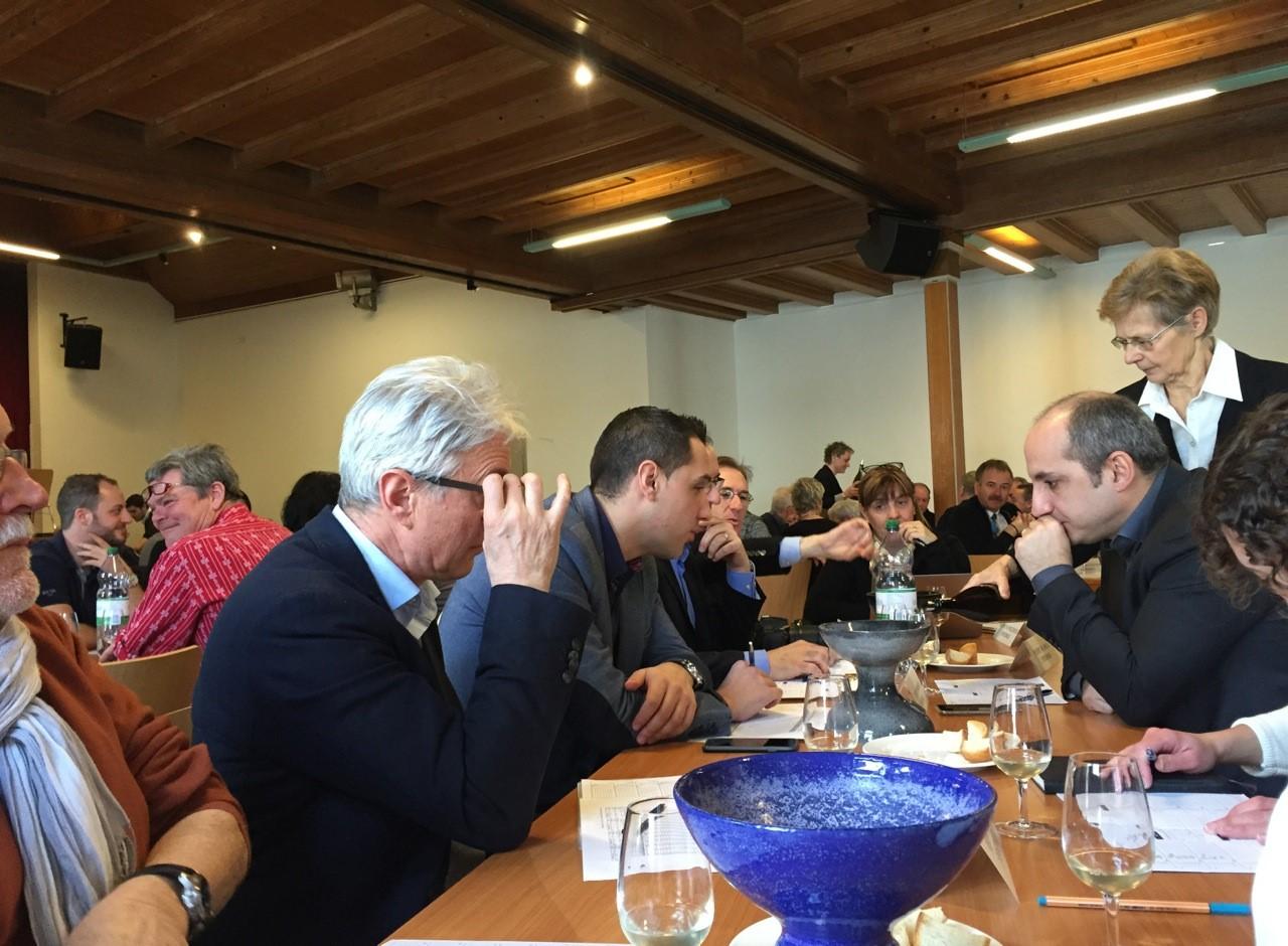 オークションにはもちろんプロのバイヤーもいたが、ホテルやレストランの経営者も多くいた。加えて私のような物見遊山で来た人も居る。その人達が入り混ざって長テーブルに座り、おしゃべりしながらワインを試飲し競りに参加する。誰もが気楽に普段着で参加出来るオークションなのだ。 それにサービスが素晴らしい。黒の上下に中は白のブラウスという正式な出で立ちで、給仕のプロが競りにかかる樽のワインをグラスに注いでくれる。しかも、2013年にソムリエ世界一に選ばれたパオロ・バッソ氏が試飲中のワインについて解説をしてくれるのである。何という贅沢。こんなまたとない機会が、くどいようだが、無料で誰にでも開かれているのである。
