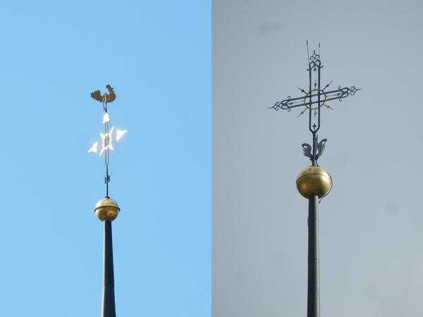 それぞれの教会の尖塔に注目すると、ひとつには十字架、もうひとつの方には風見鶏が飾られていて、前者はカトリック、後者はプロテスタントの教会だということがわかる。そして更に珍しいことには、このプロテスタントの教会は、1694年にカトリックのクール大司教が経費を支払って建てた教会なのだ。