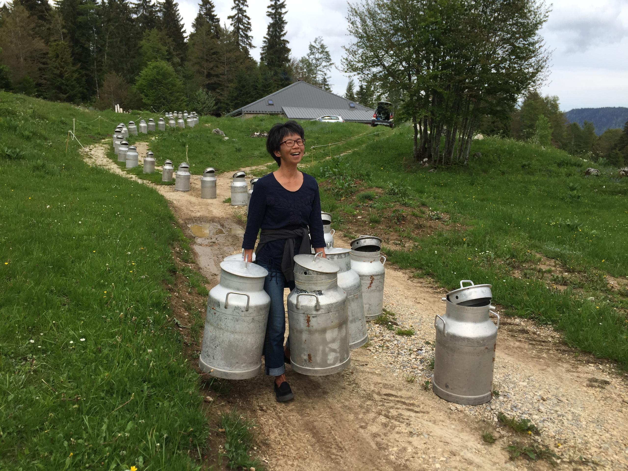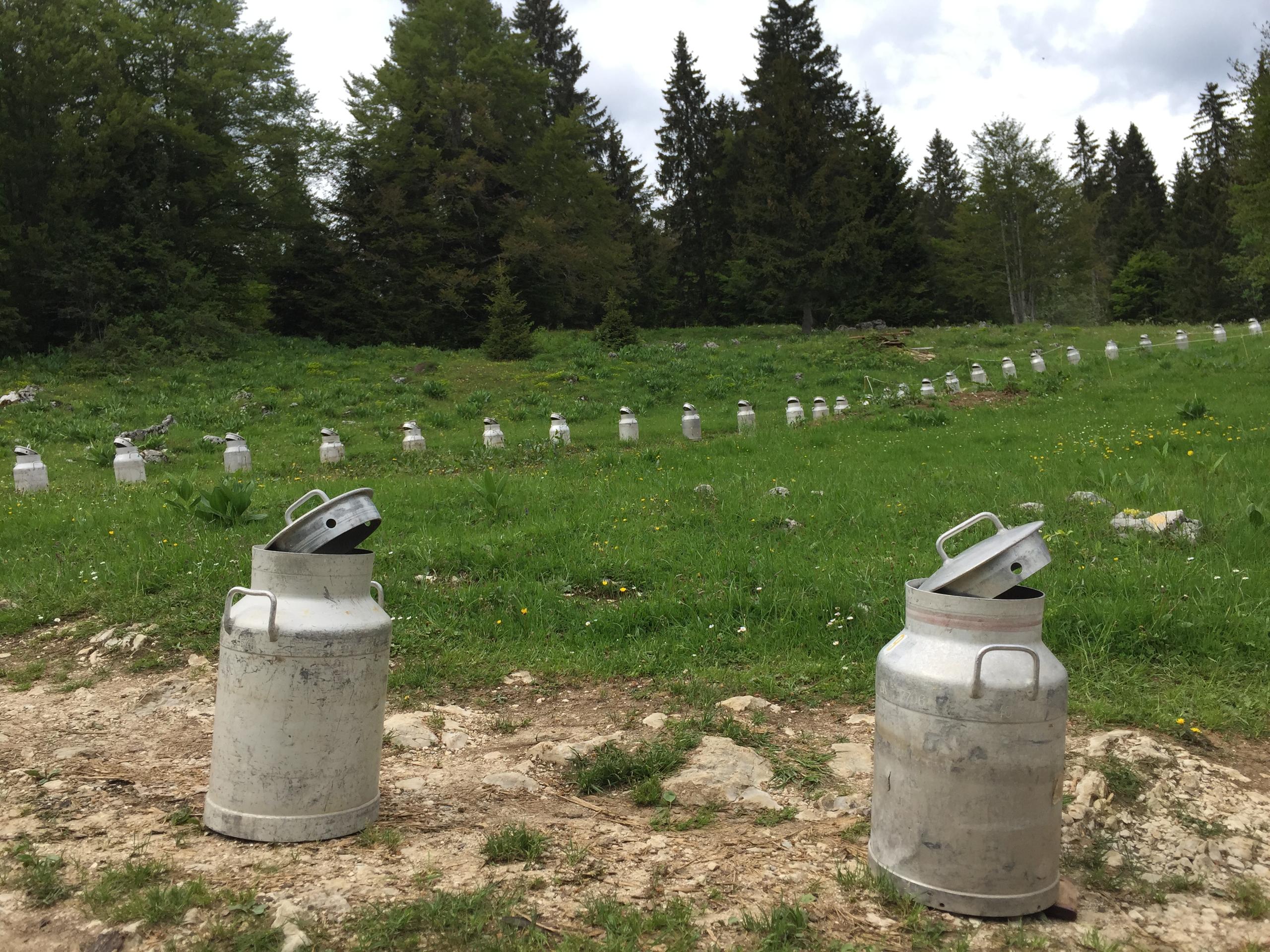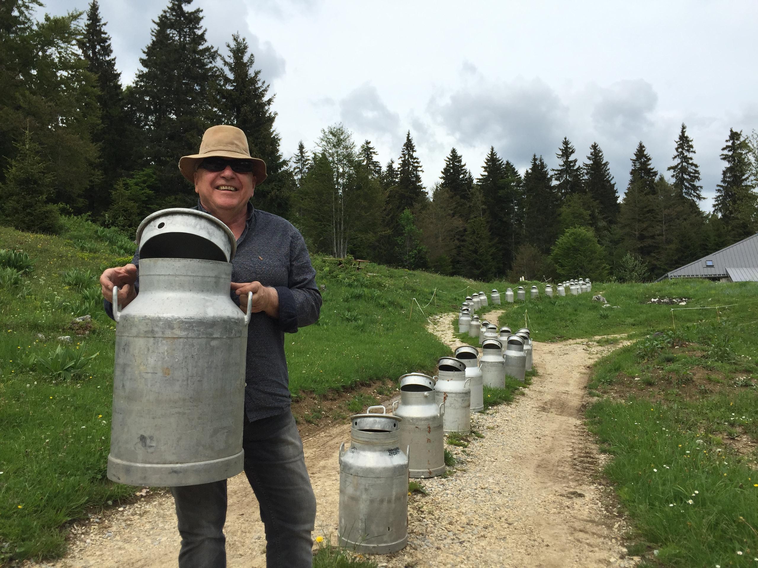 スイスとフランスにまたがるジュラ山脈に牛乳缶でランド・アートを創る写真家がいる。気持ちよく晴れ上がったある日、彼が夏の間暮らす山小屋に出かけてインスタレーションを手伝った 。