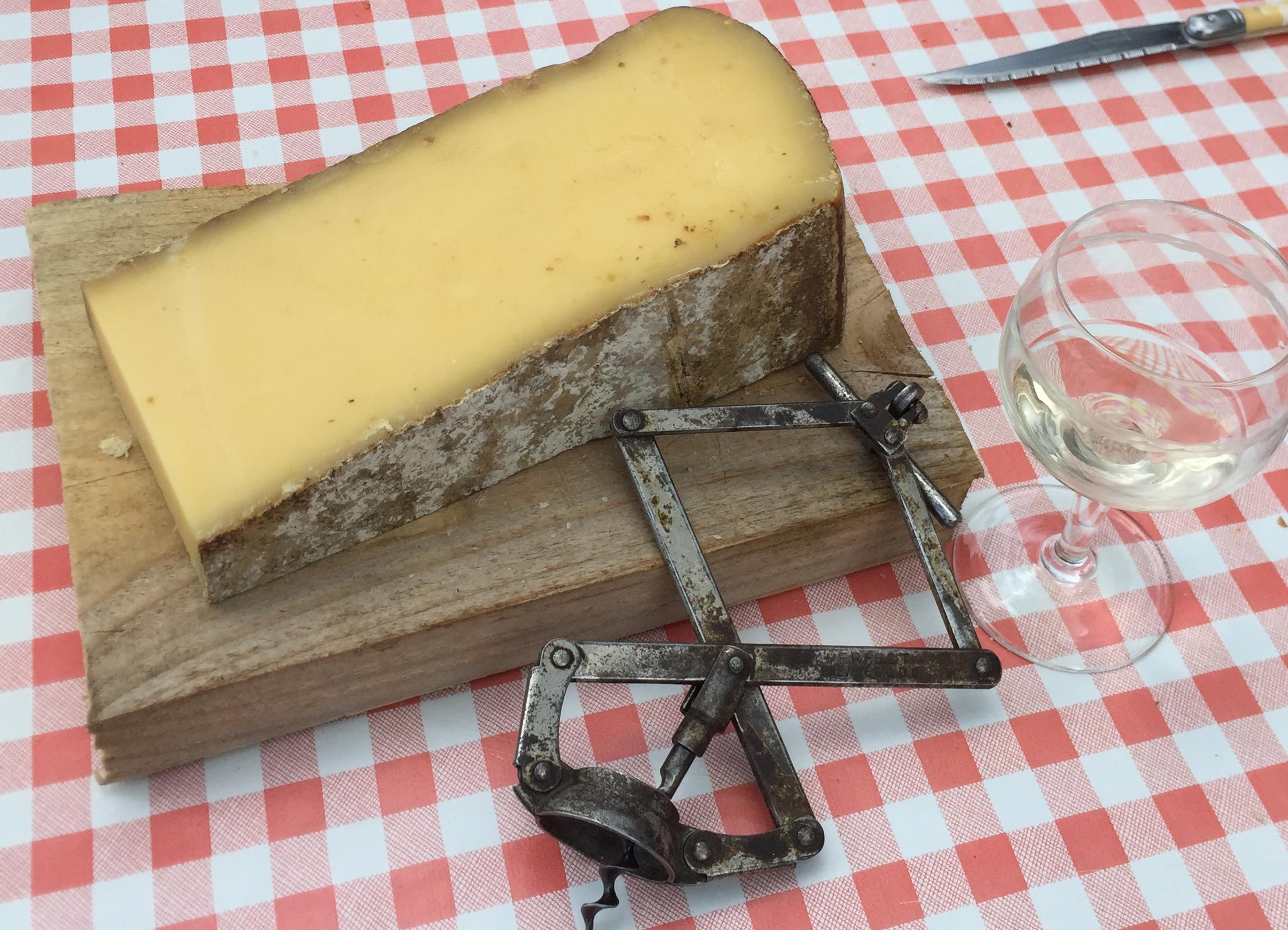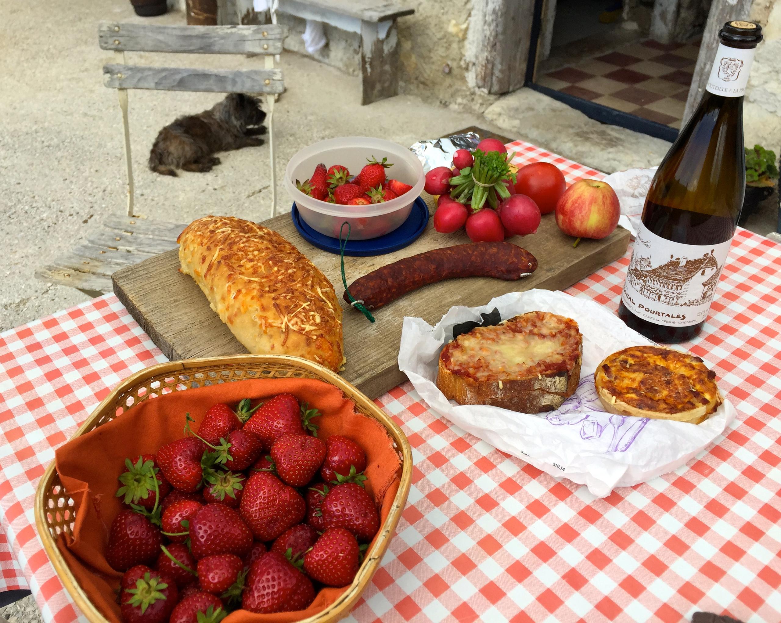 牛乳缶ランド・アートは体力がいる。まずは腹ごしらえ。季節の果物と野菜。それに美味しいフランスのパン! チーズは放牧牛のミルクだけを使ったフロマージュ・ダルパージュ。草の香りが口中に広がる。