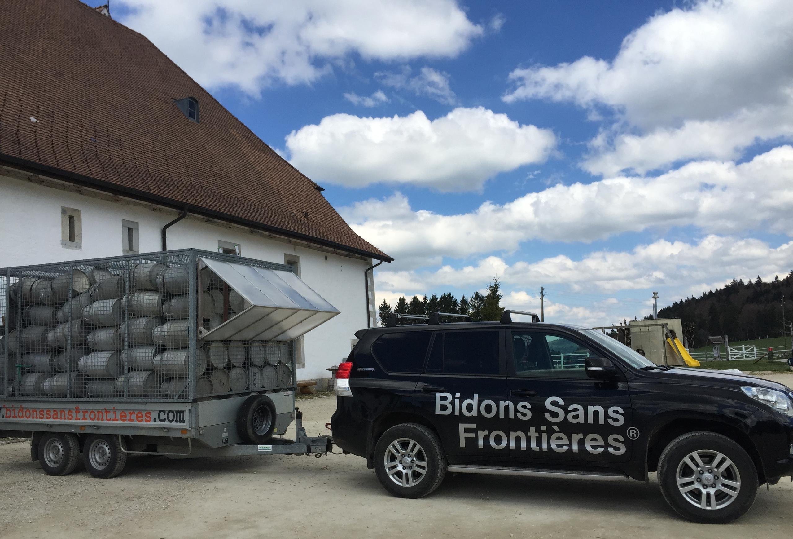 牛乳缶を積み込んだトレーラーを四駆の車で引っ張って何処へでも行く。これまで集めた牛乳缶は350あまり。