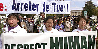 中国政府は国連人権委員会で中国の基本的人権の侵害に関する決議案の討議を凍結するべく、10年間様々な手段を用いてきた。18日、人権委員会会議で中国の「集会、表現、宗教の自由と公正な裁判および司法手続きの抑圧」を討議するため中国人政治亡命者やチベット人追放者らはジュネーブ国連本部に入っており、法輪功のメンバーらは国連ビル前でデモンストレーションを行った。