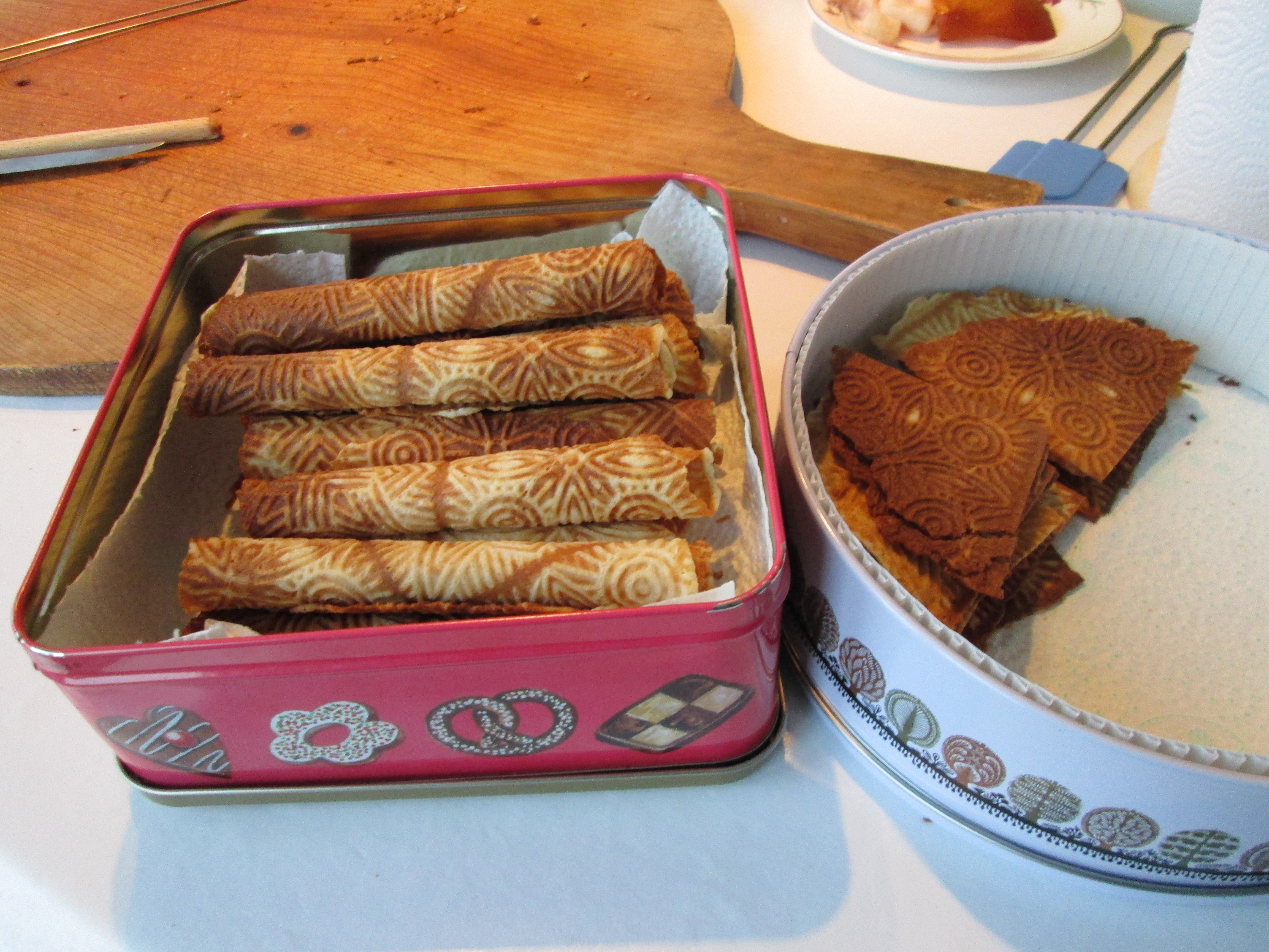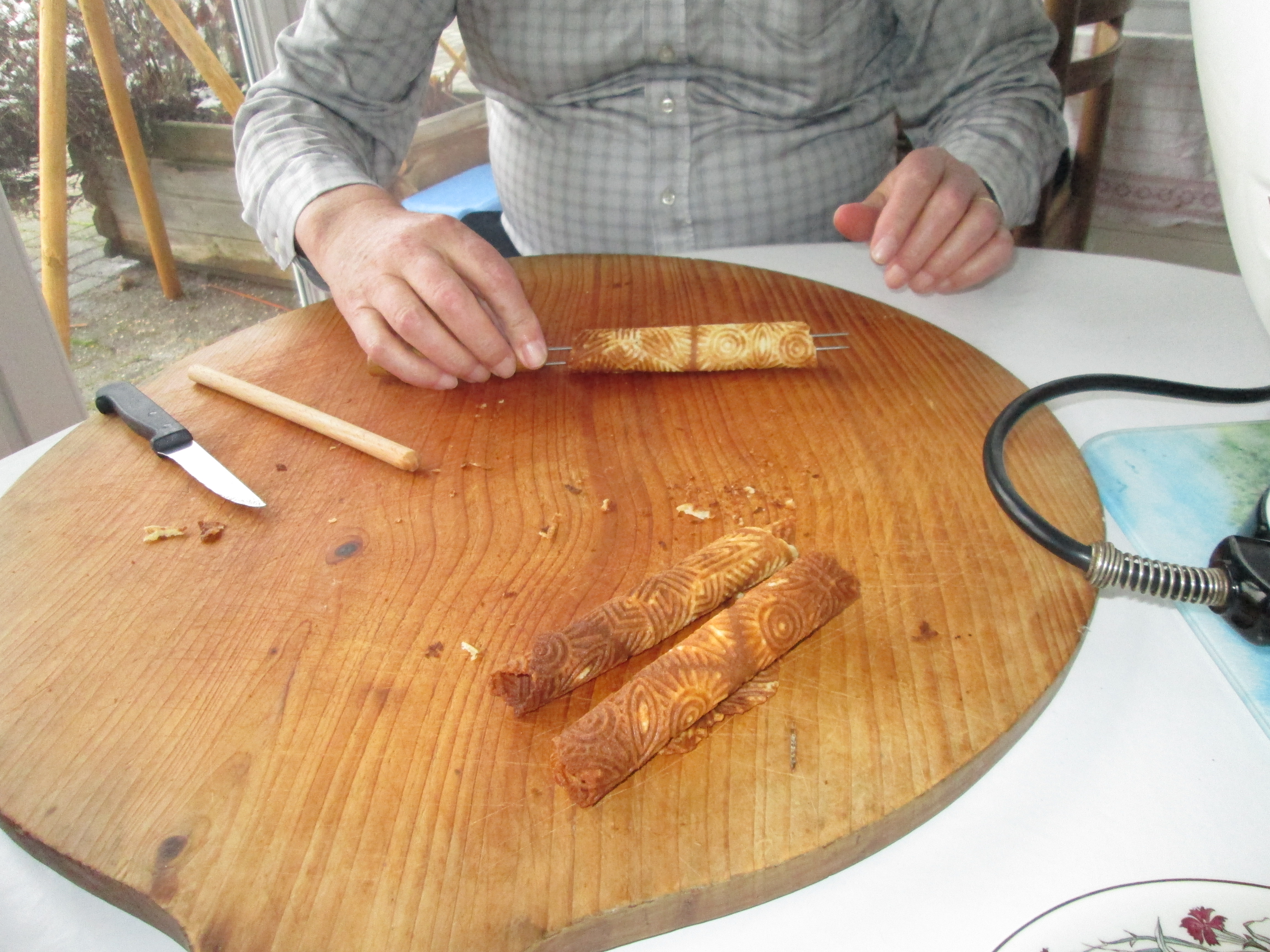 焼きたてのブリスレを暖かいうちにロール状に巻いたり、扇型に切ったりする仕事はご主人のフィリップさん(Phillip Gibbs)が担当します。一見、簡単で単調な作業に見えますが、きれいに焼けたブリスレを葉巻状にクルクル巻くには慣れとコツが必要です。好みによってはロールの中心にチョコレートを入れて巻くこともあります。フィリップさんは自作の巻き棒でブリスレを巻き上げます。職人技と言えるかもしれません。出来上がったブリスレは完全にさまし、缶に入れて保管しておくと長期保存ができます。
