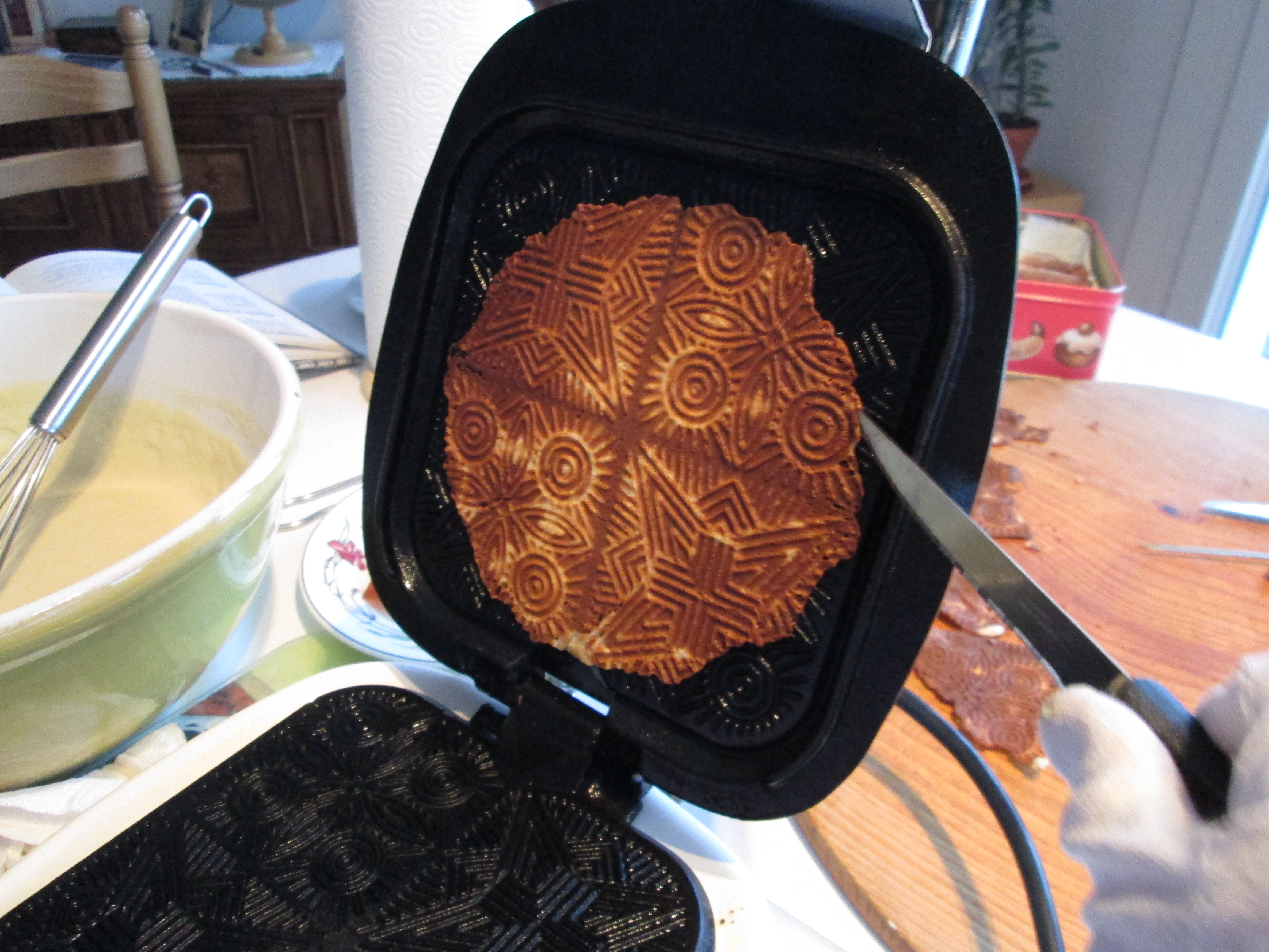 温めた焼き型の中央にブリスレ生地を落してから、やさしく生地をプレスします。エリザベスさんはこの際、素早くタイマーをセットして焼き時間を計ります。焼き時間は焼く方法や機械によって異なりますが、ブリスレの質を決める大切な鍵です。部屋中にブリスレの焼ける良い匂いがたちこめてきました。タイマーが鳴り、黄金色に焼けたブリスレを取り出し、まな板の上に置きます。ここまでがエリザベスさんの仕事です。彼女はこの作業を生地が無くなるまで繰り返します。