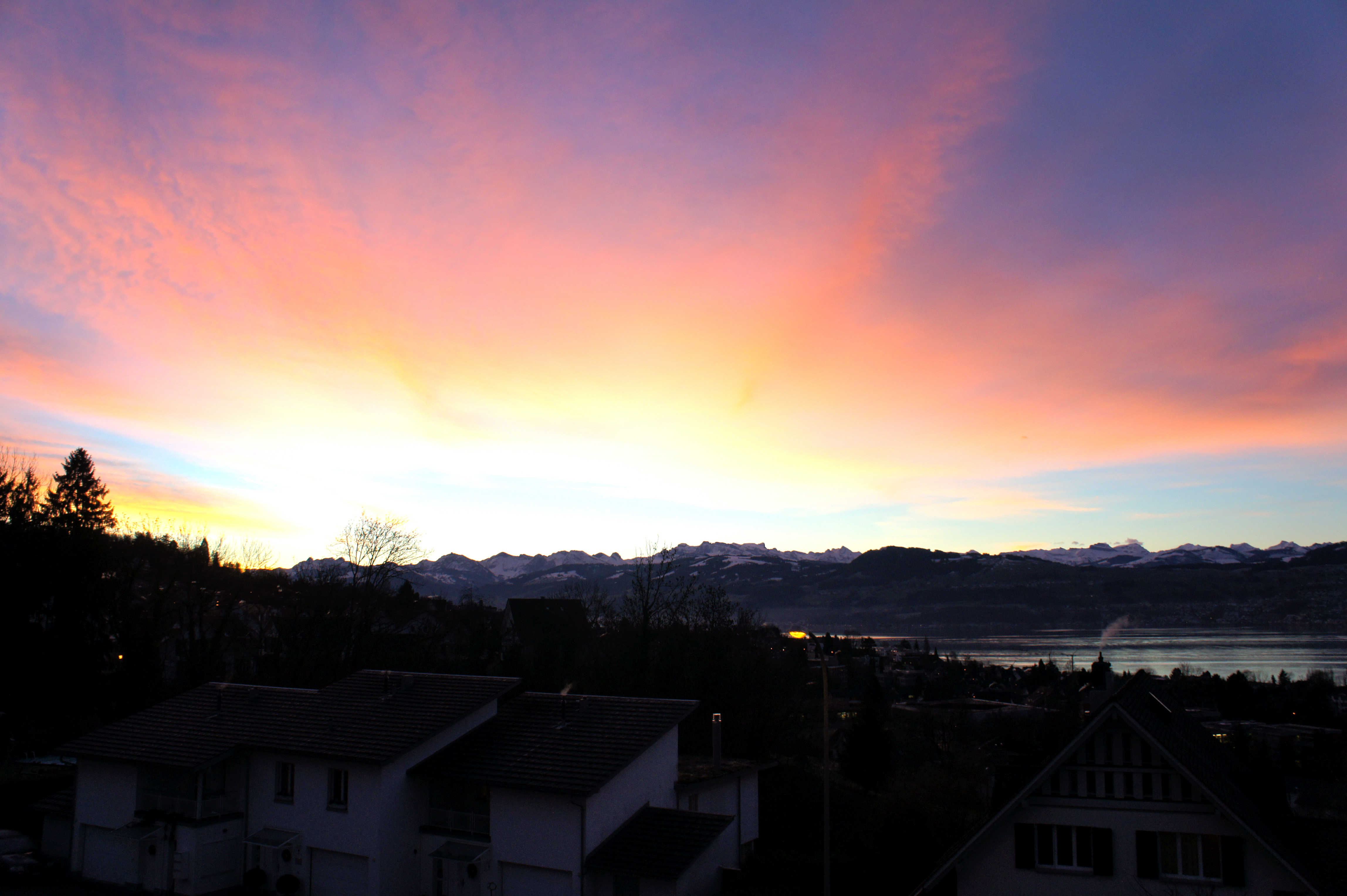 澄みきった冬の空気が漂う中、眼前に広がる美しいアルプスの朝焼け。この風景は私の住むチューリヒ州湖岸の町に広がる朝の景色で、冬から春先にかけての晴れた日にのみ眺められる特有の湖畔の冬景色でもある。とは言え、この独特な空と風景は、年間の季節を通じて一度たりとも同じであった事はなく、一分一秒ごと、またとは目にする事のない幻想的な世界が広がる。