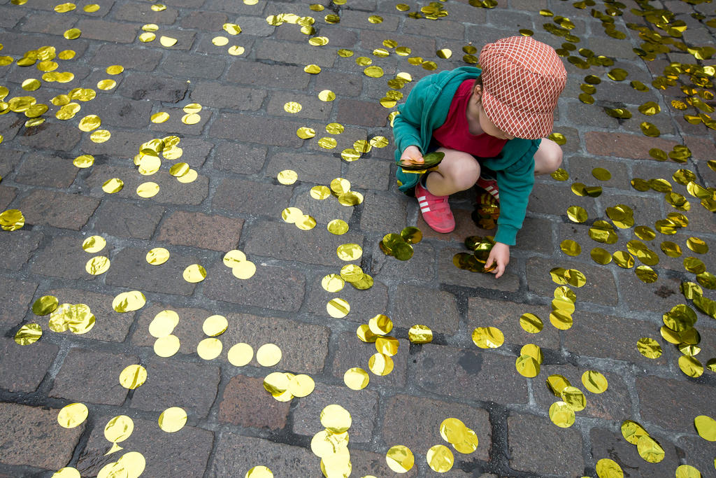 バーゼル州のベーシック・インカム導入案の支持者は数多く、またアーティスティックなキャンペーンを繰り広げてきた。5日の投票日も、紙製の「金」を投票場周辺にばら撒いた swissinfo.ch