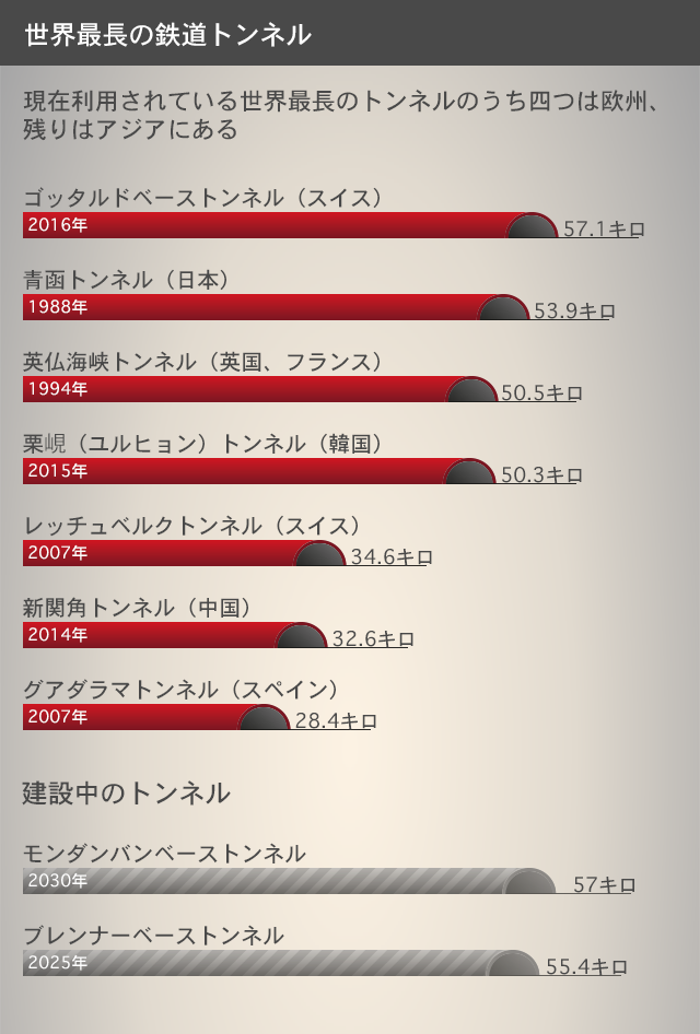 以下の図は、ゴッタルド基底トンネル開通当時の世界の鉄道トンネルだ。その後、中国の松山湖トンネル(38.8km)、深圳・香港間トンネル(35.7km)が建設された。