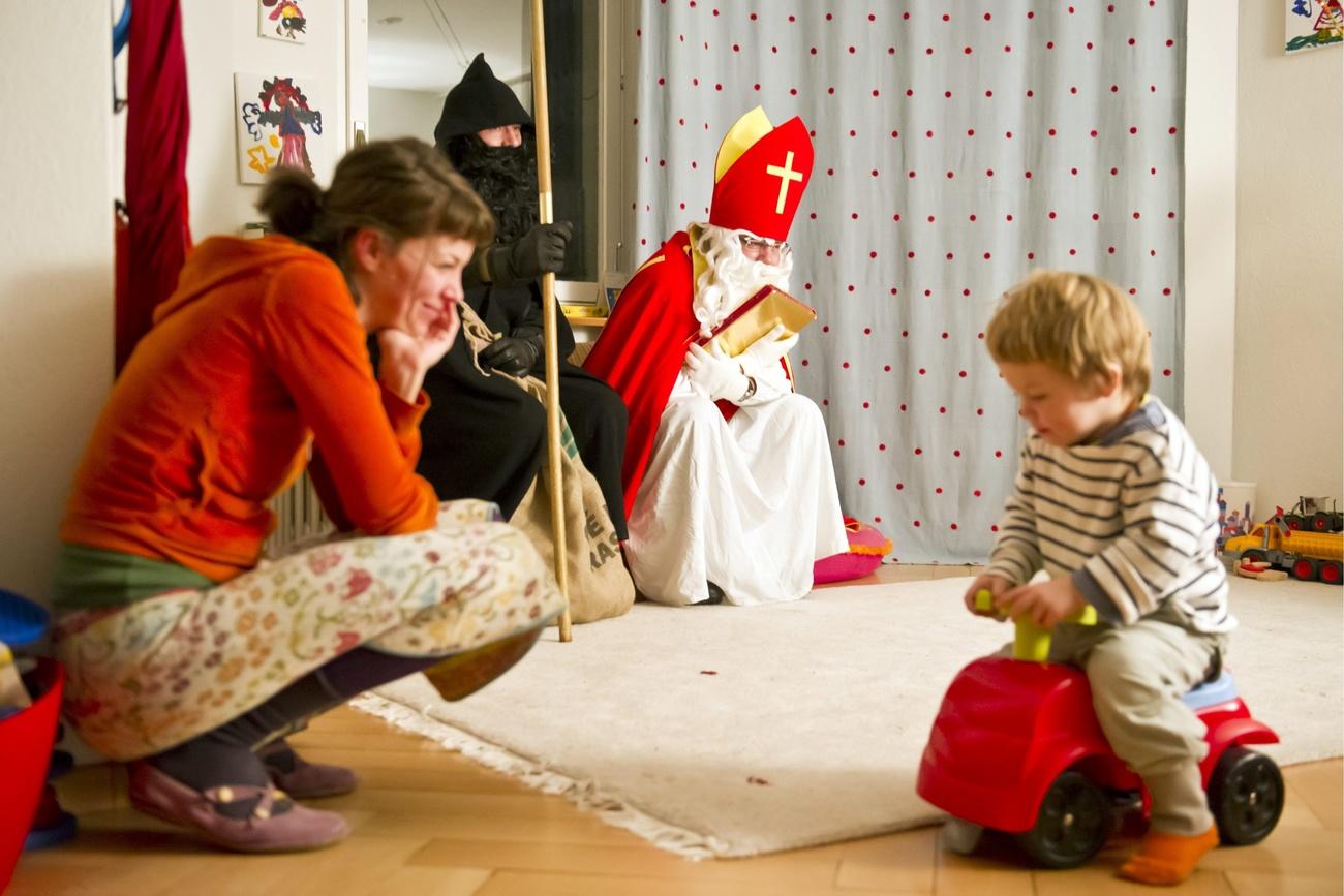 サンタ養成コースを主催するのは、220人の熱心なボランティアが集まる非宗教団体、チューリヒ市聖ニコラウス協会外部リンクだ。同協会には、「サミクラウス(スイスドイツ語で聖ニコラウスの意)」、「シュムッツリ(暗い服を纏った従者)」、「エーゼリ(ロバ)」から成るチームが40組ある。これらのチームは、アドベント(待降節)と呼ばれるクリスマスイブまでの約4週間のうち12日以上を、子供やお年寄りがいる家庭、幼稚園、学校、病院など約1千カ所を訪問する時間に費やす。サミクラウス達はお話を読み聞かせ、クリスマスソングを歌う。茶色のガウンを頭からすっぽり被った恐ろしい姿のシュムッツリは、サミクラウスの別人格(暗い面)とされる。エーゼリは運転手だ。サミクラウスが昔ながらのロバに乗る場合もあるが、この協会では、移動手段はもっぱら車だという。