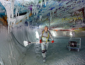 さらに海水が入り込むマヨルカ島の洞窟のイメージが基本にあると、この島出身のアーティストは言う。3万5000キログラムの絵の具を、鍾乳石のように天井から垂らし、しかも会議中の人の頭に落ちないような安全性を図るには、技術的にもかなりの困難があったという。アトリエで一年間研究し、現場で13カ月間かけ20人のアシスタントを使って制作した。