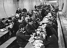 防空壕は「絶対に安全」。1メガトンの原子爆弾が爆発し、1キロメートルごとにある窓に強い空圧が掛かったとしても、防空壕が壊れることのないように設計された。2本のトンネルの中央部には横穴が掘られ8階建てになっている。ここには、司令部、手術室も備わった病院、ラジオ放送局、多目的ホールなどもある。