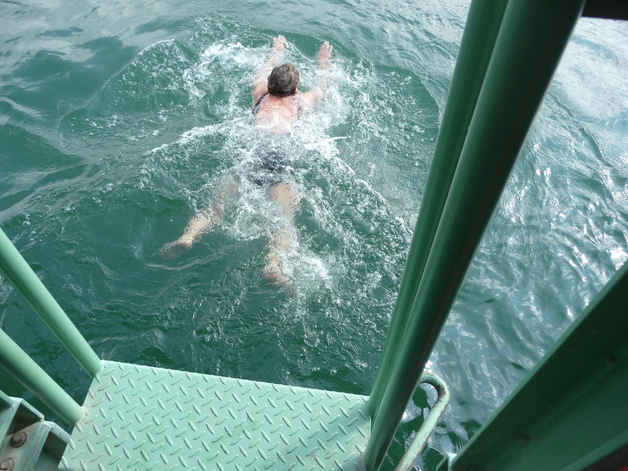 その日、水温は22度。訓練の甲斐あって私は難なく水に入ることができた!……囲みの中は木の葉や鳥の羽が浮いていてきれいとは言い難く、やはりライン川を実感したくて、囲みの外側を泳いでみた。