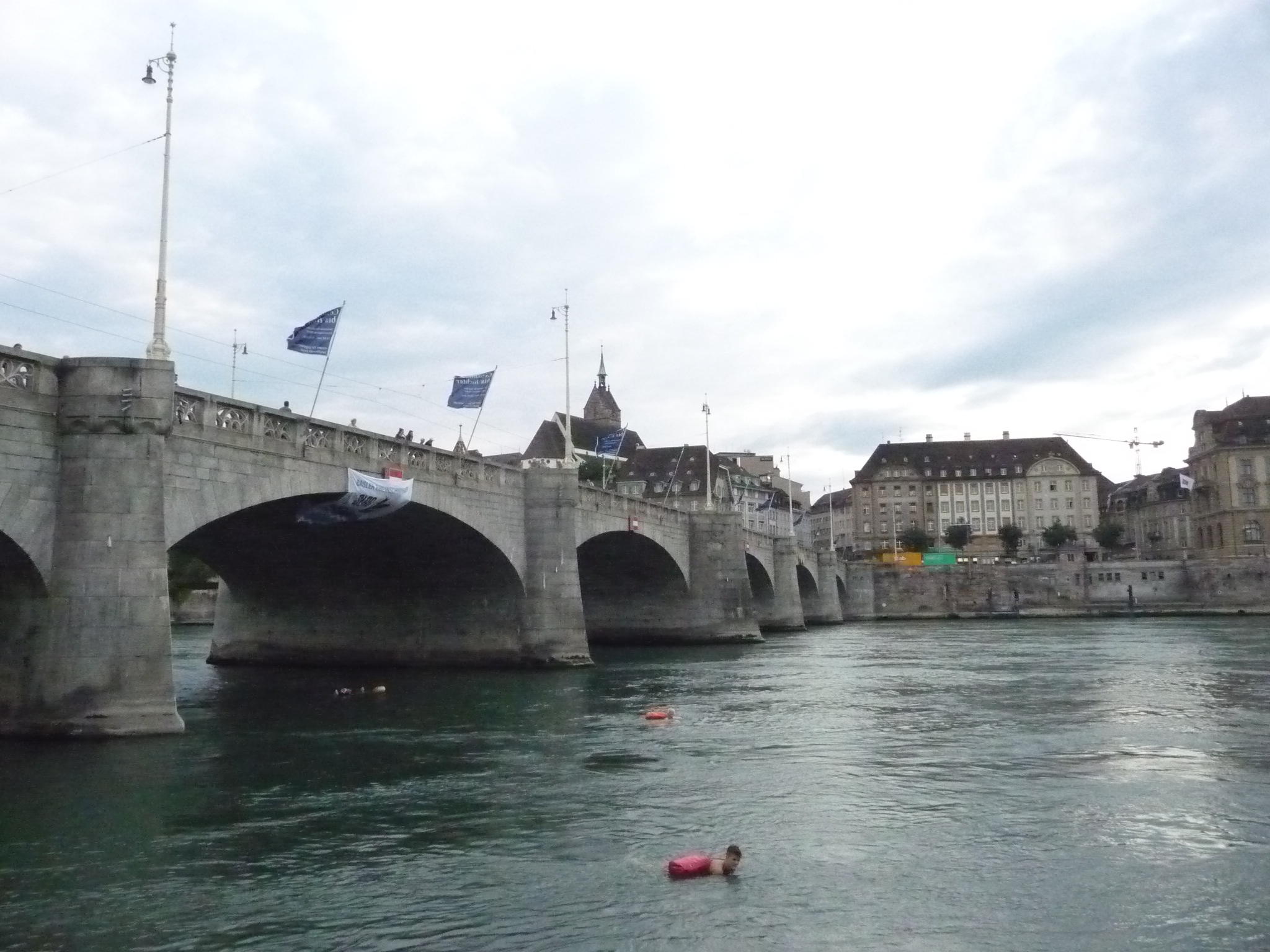 が、しかし。いくらなんでもラインで泳ぐなんて。だって水は冷たいだろうし(夏でも水温は20度前後)、流れも速いし(秒速2~4メートル)、川底はかなり深いだろうし(水深2~7メートル)、川幅だって広い(5つの橋は平均250メートルほど)。バーゼルの至るところにプールが(20カ所近く)あるのに、なにもわざわざそんなところで泳がなくても!