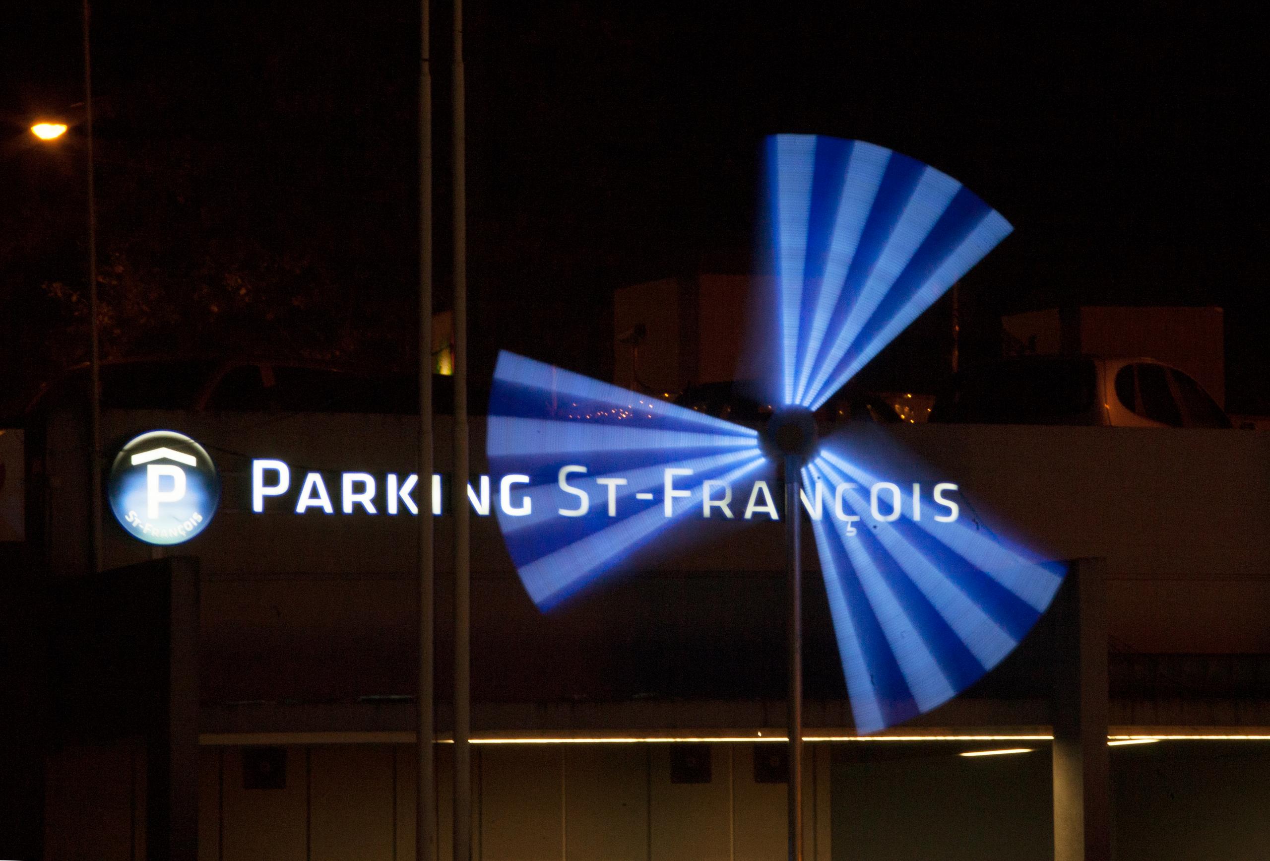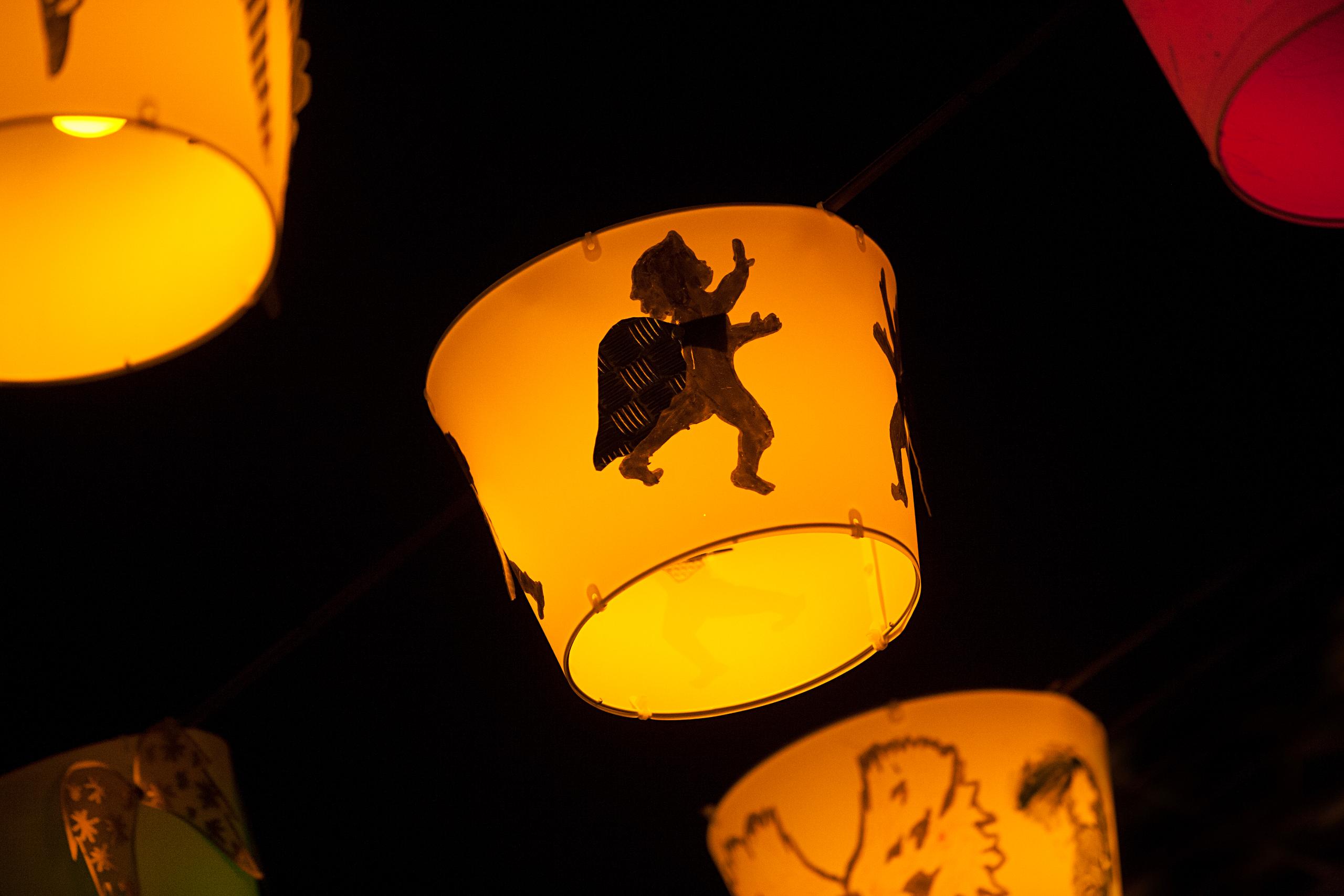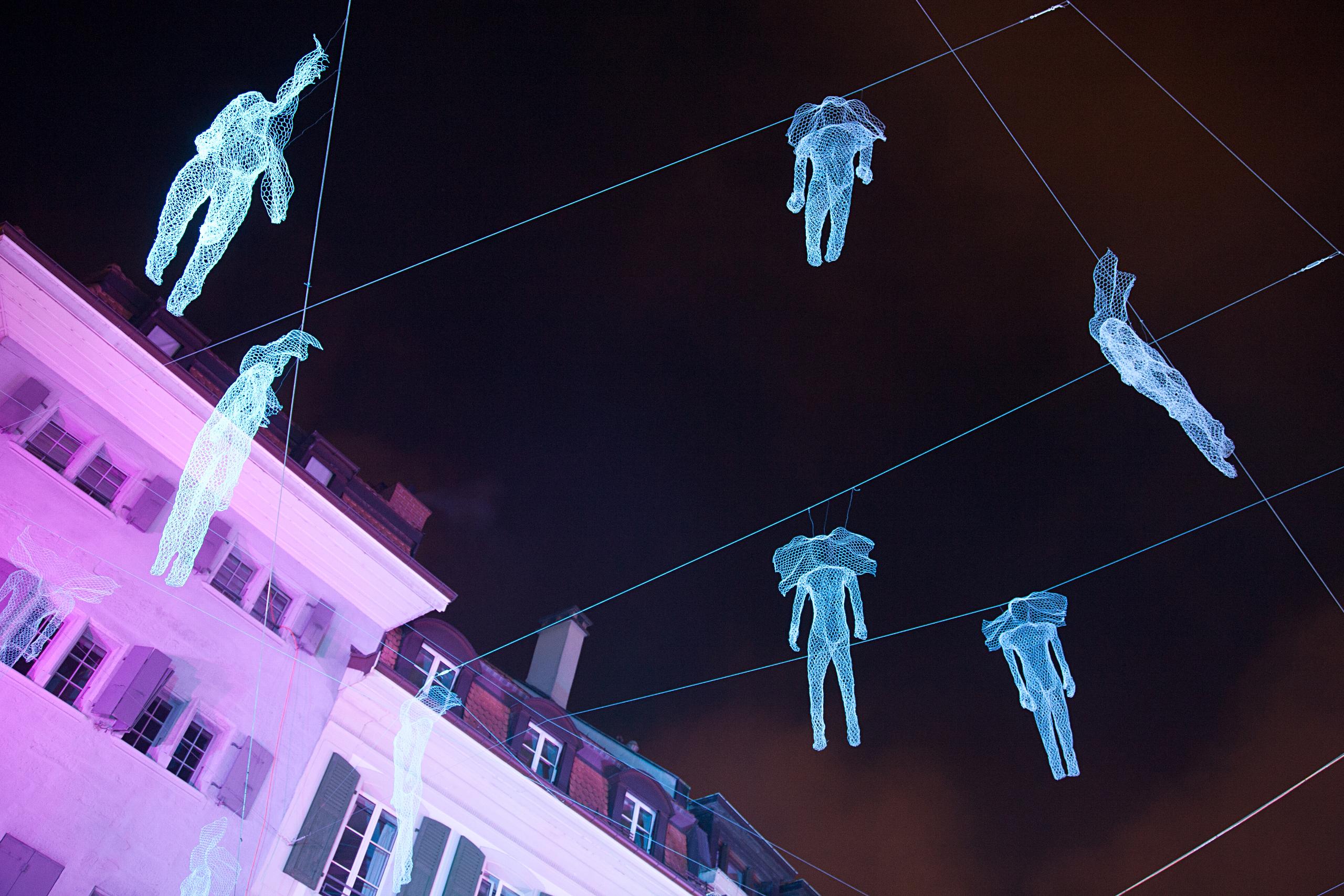 風車、ランプ、光の糸で作られた人形や雲、動物たちが暗闇に浮かび上がる。光の作品たちがヴォー州州都の壁や屋根を美しく飾っている。