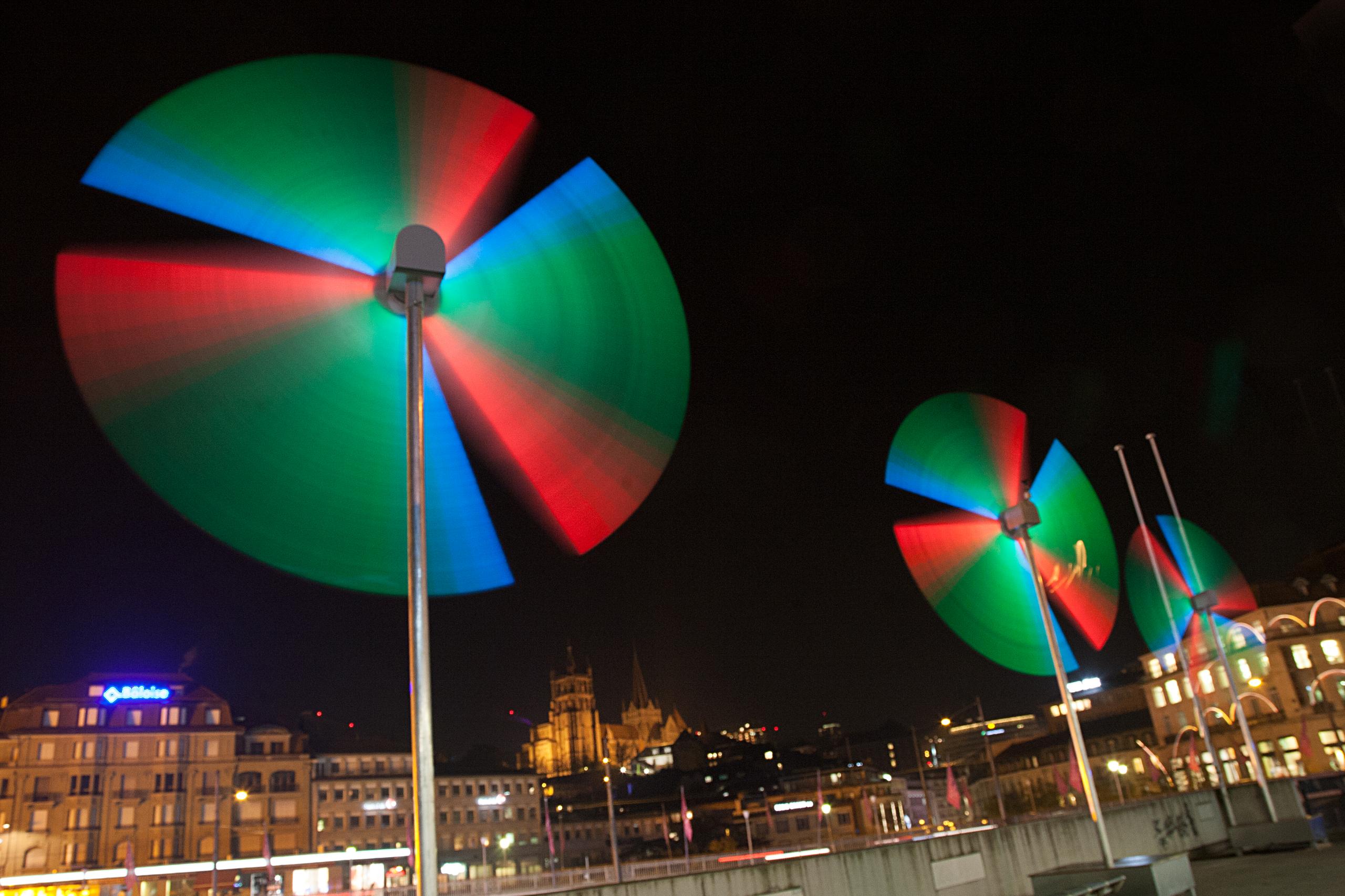 今年で3回目になるフェスティバル「ローザンヌ・リュミエール外部リンク」に招かれたのは、光アートに精通した経験豊かなアーティストばかり。スイス、フランス、ドイツ、フィンランド出身のアーティストたちの作品はフェスティバル期間中、屋外に展示されたままだが、どんな天候にも耐えられるようになっている。作品の中には、これまでに世界各地で開かれたフェスティバル、例えば有名なリヨンやドバイの光の祭典に出展されたものもある。