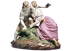100近い型から作り出されたという人形はすべてロココ調。カップルの人形は、例えば帽子を持つ女性と麦の束を抱える男性が「夏」を表し、黒人の人形がアフリカを表したりと、すべての人形は何かの寓話(ぐうわ)である。これらはお茶会や、お祭り、儀式の際に食器類と一緒にテーブルの上に飾られたという。