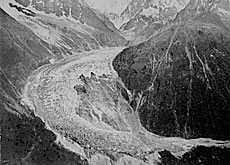 モンブランの北壁にある、長さ12キロメートルの氷河。標高4000メートルから1500メートルで、32平方キロに広がる。西部アルプスで、最も長く、大きい氷河。