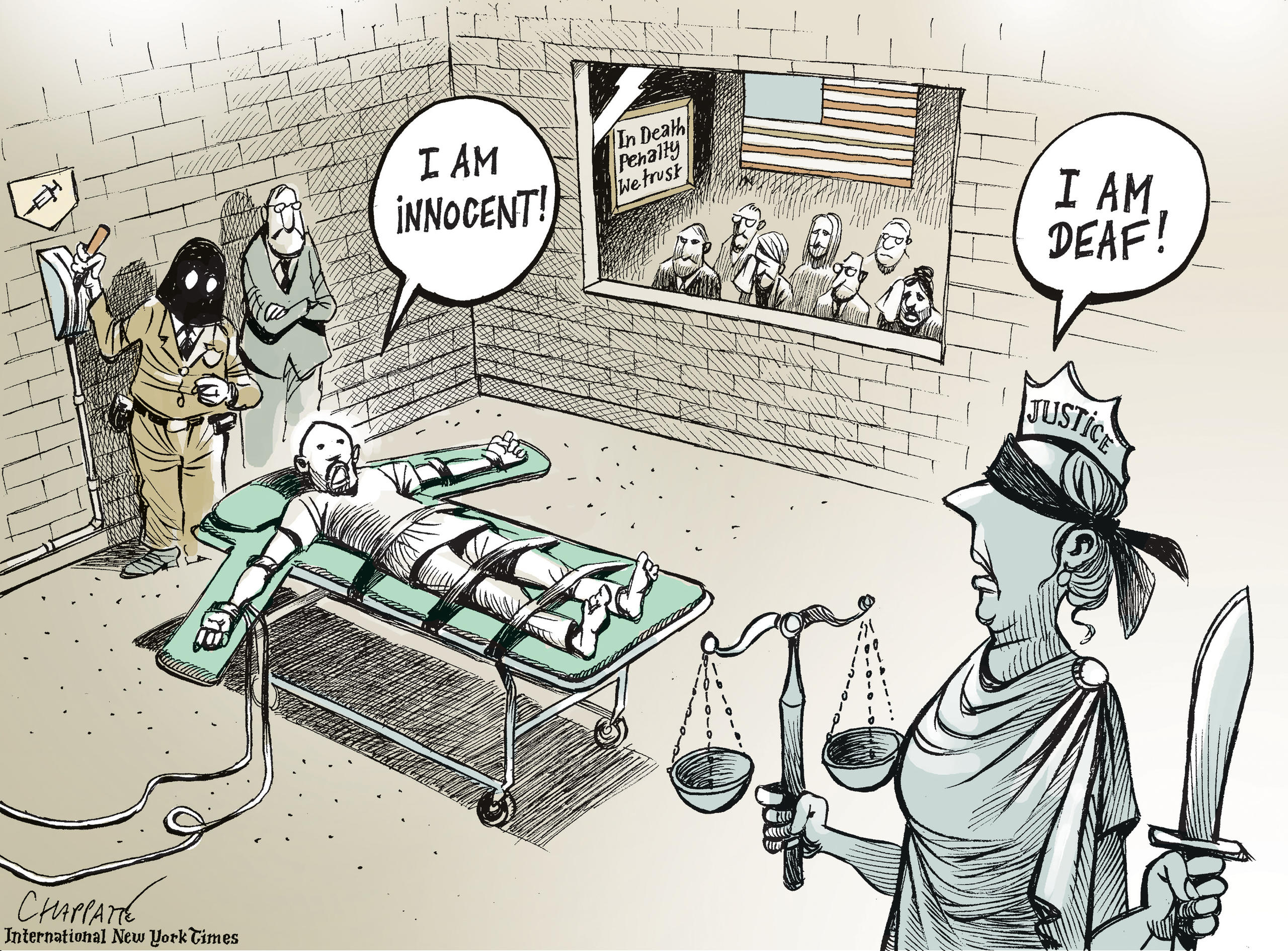 スイスの有名な風刺漫画家のパトリック・シャパットさんは、アメリカに滞在し、ニューヨーク・タイムズに風刺漫画を描く仕事を引き受けた。そのときに出会った仲間たちに、「死の廊下」について作品を描いてくれるよう依頼した。