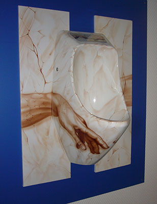 「マクロロンはエネルギッシュな合成素材なので、陶器製の小便器のように、排出された尿が冷える、残る、シミができるなどということもありません。また、バクテリアがたまるようなシャープなへりも小便器にはありません」
