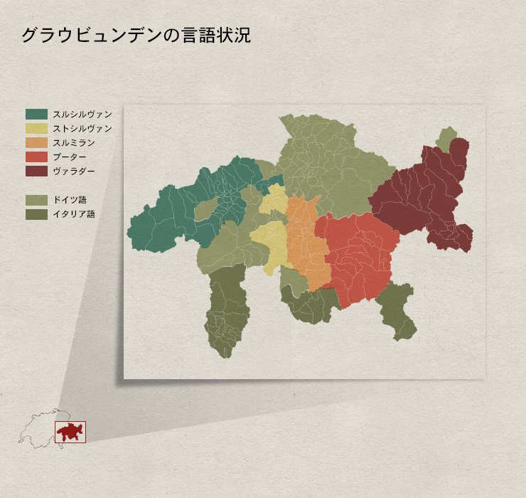 グラウビュンデン州には山と谷が多く、小さな村が散在している。孤立した地域の言語によく起こることだが、ロマンシュも多くの方言に分かれ、その一つ一つが5種類ある書き言葉のバリエーション(イディオムと呼ばれる)のどれかに属する。