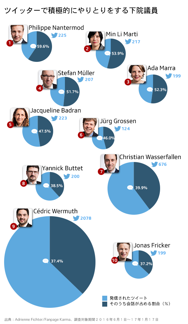 スイスインフォはスイスの下院議員50人が2016年6月1日から17年1月17日の間に行ったツイッター上での会話(ユーザーとのやりとり)を評価。調査対象者は、クラウトスコアで最も高い数値だった下院議員。クラウトスコアとは、ツイッター上の影響力を数値化した指標だ。