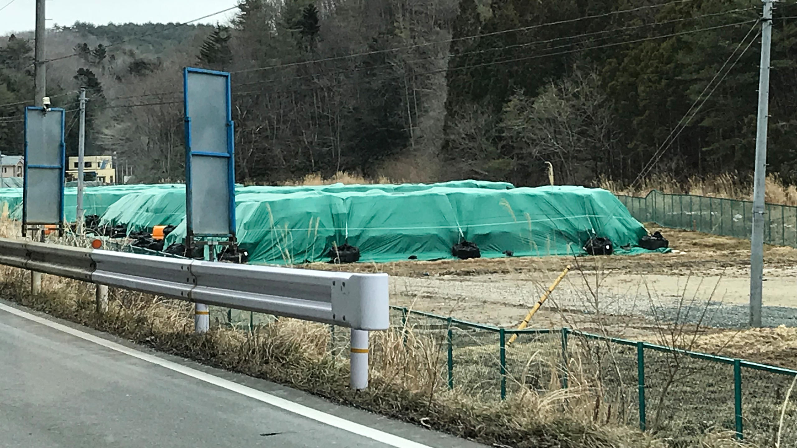 海岸線の鉄道は安全上の理由から閉鎖されたままだが、国道6号線は4年前、再び開通した。このルートに沿って、汚染土を覆った緑色のビニールシートが延々と続いている。