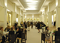 会場に一歩足を踏み入れると、そこは白、ベージュ、茶で統一された広々としたリビングルームのような空間。左右のブースの間にある廊下が、ソファー、テーブルを設置することで、そのまま食事ができる空間に変身。そこで招待客は商談後の休息をゆったりと取る。