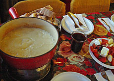 さてお目当てのフォンデュ。白く柔らかく溶けたチーズがほんのりワイン味でおいしい。グリエールチーズとヴァシュランチーズを使っているからだという。後者がこのトロリとしたまろやかさを醸し出す。パンも素朴な味で、上品なフォンデュとよく合う。