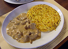 ガイドブックによく紹介される「観光客必須」のレストラン。今回試食したのは「チューリヒ風子牛のゲシュネツェルテス ( Kalbsgeschnetzeltes nach Zürcher Art ) 」。子牛の細切れ肉のクリームソース和えだ。
