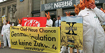 これまで東南アジアや中南米諸国の消費者団体・環境団体などは、世界最大の多国籍食品企業ネスレの現地法人に対し、遺伝子組み換え食品の販売停止に関する会談を要請してきたが、これらの現地法人は遺伝子組み換え作物使用に関する決定は全てヴェヴェー本社で行われたものとして拒否してきた。15日、ヴェヴェーでグリンピース代表らと会談したネスレの政策決定役員は、「信頼できる科学的な調査に基づく遺伝子技術の責任ある応用を支持する」とし、安全性が確認された原料のみを使用しているとした。グリンピースはネスレに対し、遺伝子組み換え作物の使用を停止し有機栽培の原料使用を要請したが、ネスレ側の答えはグリンピースの訴えを無視したものだった。グリンピース・スイスのクレメント・トルッソ氏は、「会談の結果には大変失望した。ネスレには政策を変更する意志は全くない。規制が緩く、消費者の抵抗が強くないところでは、世界のどこでも遺伝子組み換え食品を押し付けるつもりだ。」とswissinfoに語った。