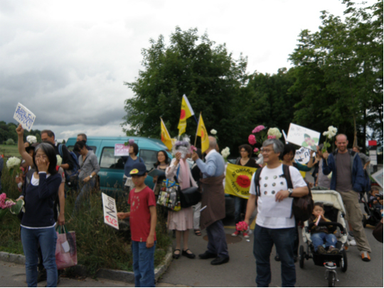 7月6日金曜日、大飯原発再稼働への抗議を日本政府に伝えてもらうためにベルンにある日本大使館まで歩くあじさいウォークが開催されました。ベルン駅に集合した有志があじさいの花を持って大使館まで歩いていったのです。