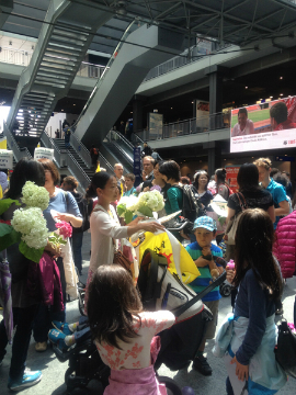 ベルン中央駅にはたくさんの人たちが集まっていて、大人も子供も、日本人もスイス人もみなそれぞれが色とりどりのあじさいの花を持っていました。職場を飛びだしてきたのであじさいを購入する時間がなかった私は、そういう人たちのためにご自宅の庭で端正に育てた花をたくさん抱えて来てくださった方のご厚意に甘える事になりました。