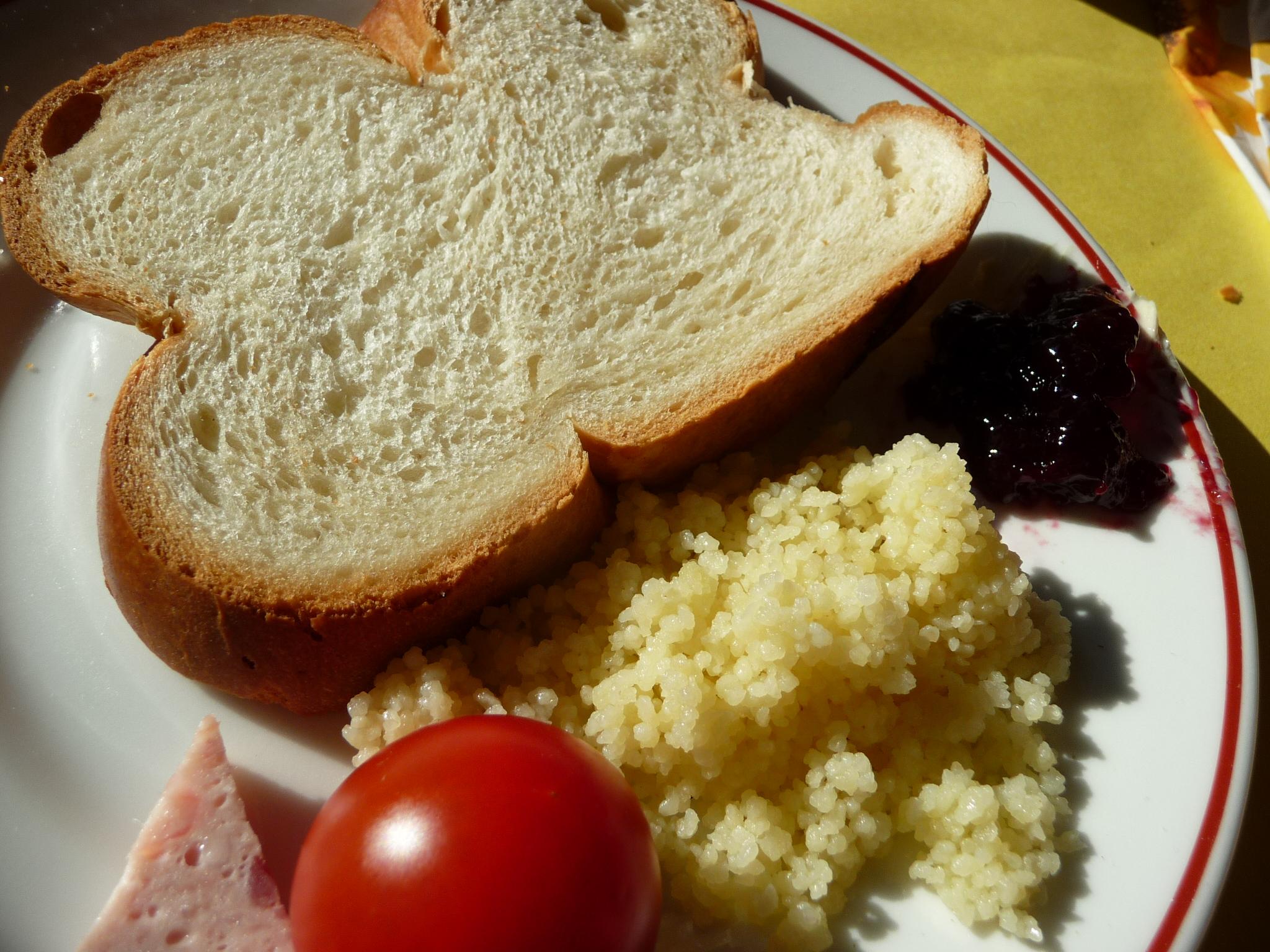 モロッコ人提供の、甘いクスクス。シナモンシュガーでおいしくいただいた swissinfo.ch