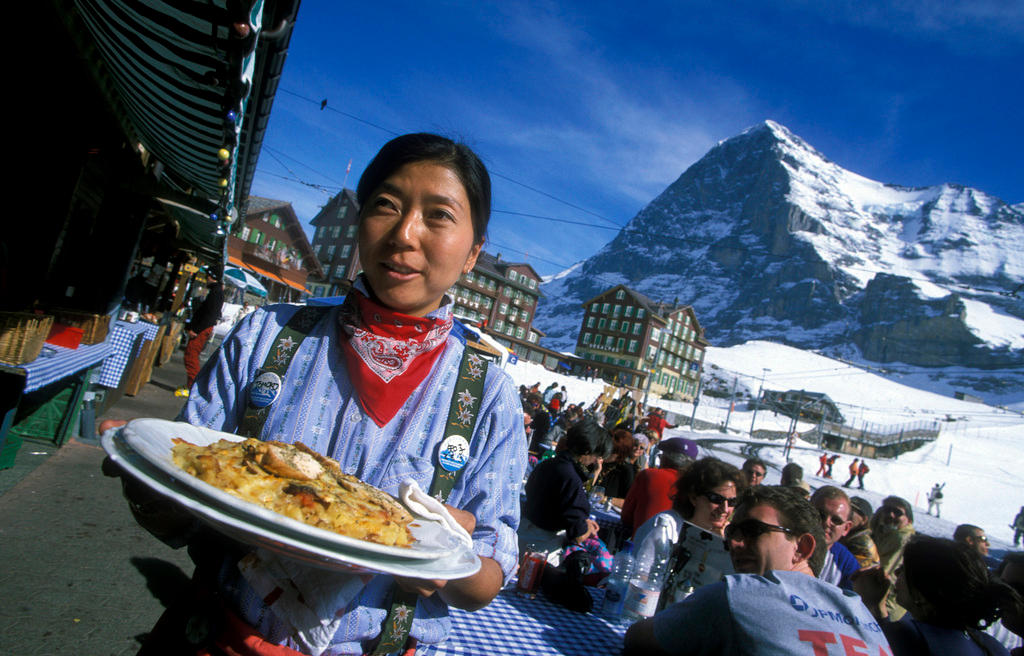 ユングフラウ鉄道のクライネ・シャイデック駅前のレストランで、アイガー北壁の景色を眺めながら、スイスの郷土料理レシュティを楽しむ観光客