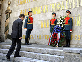 その後、スイス軍所有のヘリコプターでアンデルマット ( Andermatt ) へ。ハンス・ルドルフ・メルツ連邦大統領とともに、スボーロフ将軍の記念碑が建つ場所でロシア軍の追悼式に参列した。花輪を供えた後、メドベージェフ大統領は演説を行い、スボーロフ将軍の功績と手腕を高く評価した。