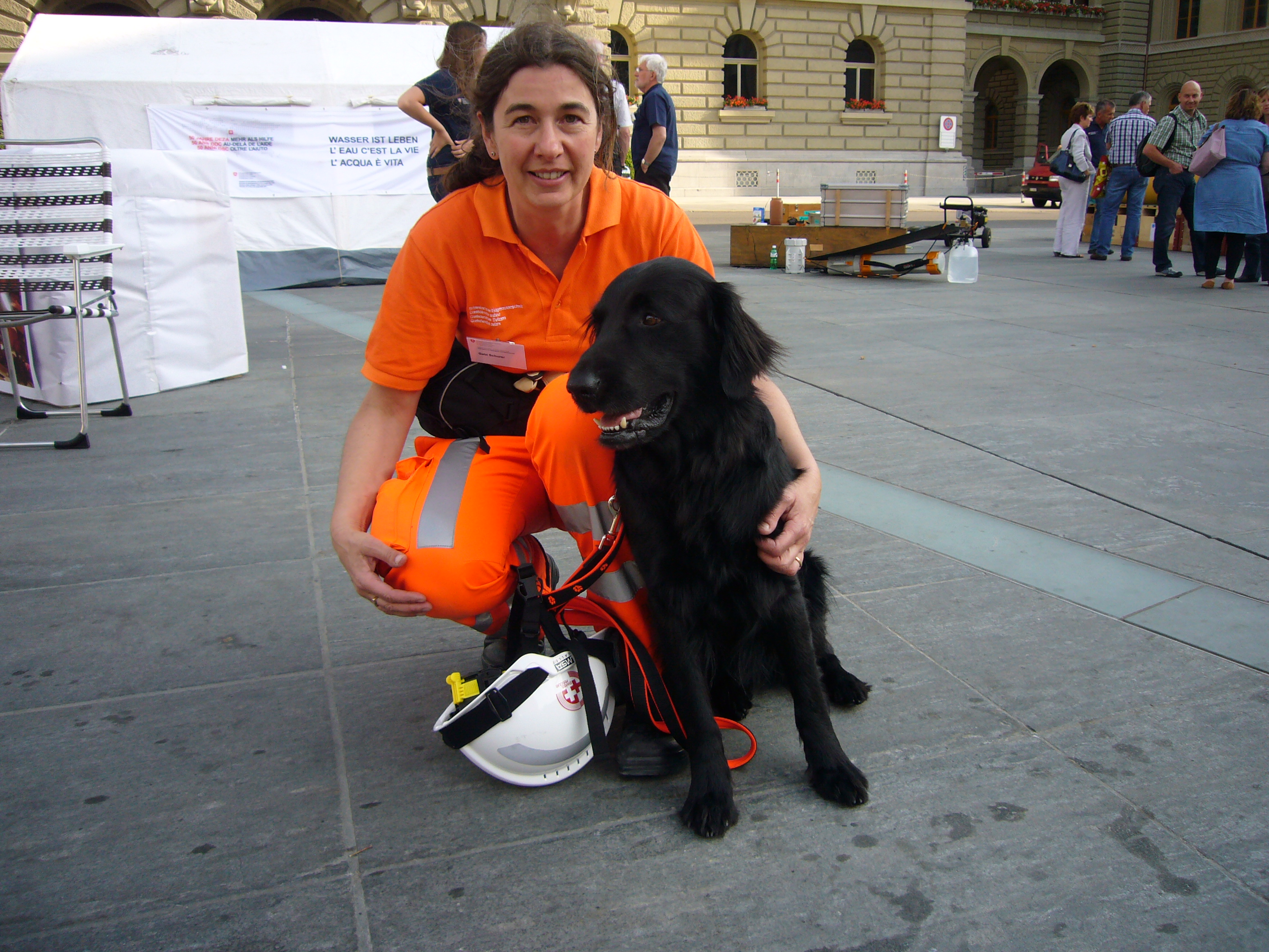 スイス連邦外務省開発協力局 ( DEZA/DDC ) は、その設立50周年に5月24日から27日にかけ、多岐にわたる活動を連邦議事堂前広場で展示した。同局に協力するスイス救助犬協会も救助の様子を公開。この機会にホルニスベルガー さん、隊員の1人で女性のガビ・ショーラーさん ( 40 ) 、救助隊の食糧や安全を確保するバックアップリーダーのウルス・ラッパーさん ( 39 ) に南三陸町での経験を振り返ってもらった。